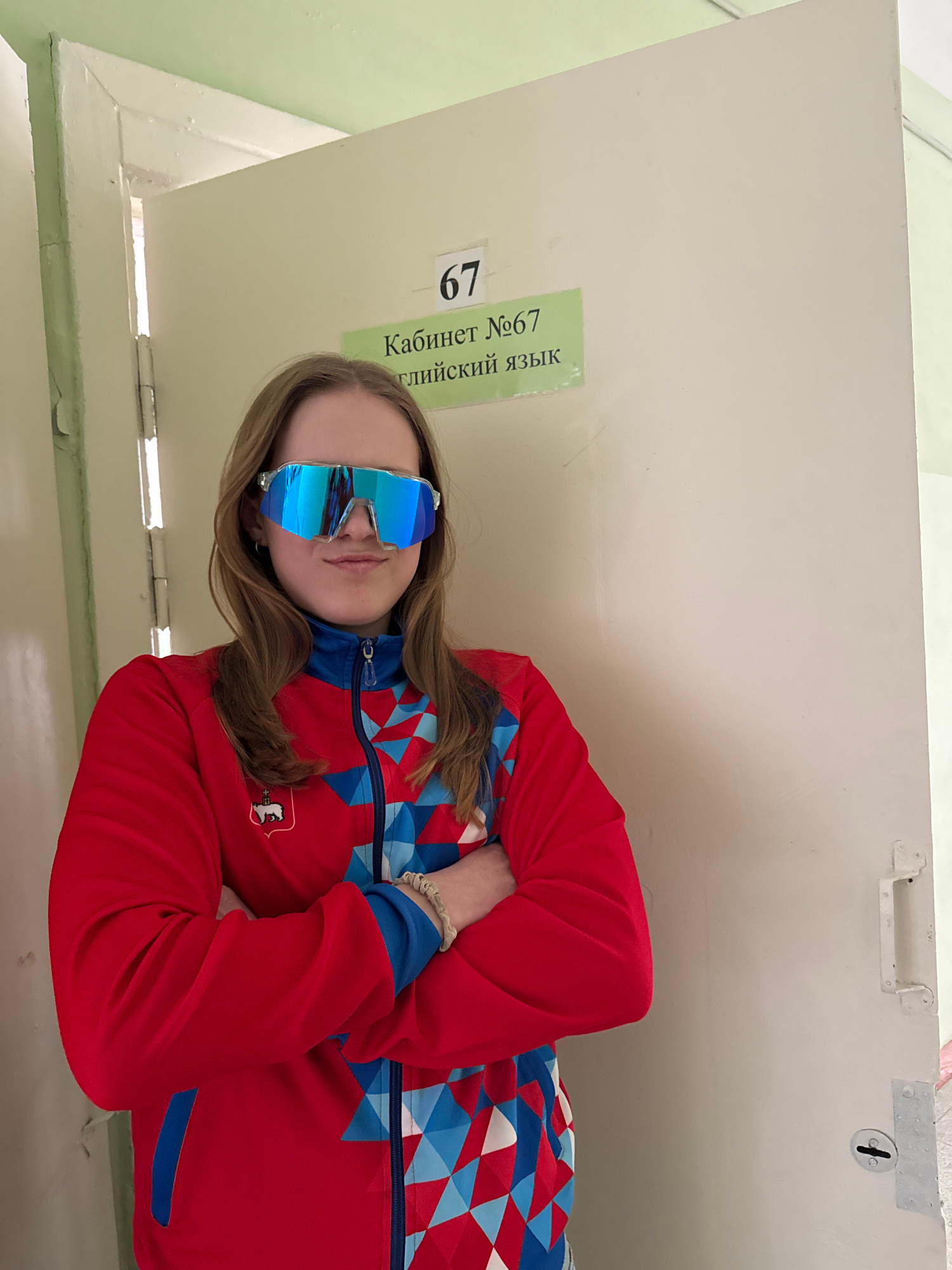 A person is standing against a light-colored door in what appears to be a room or hallway. The door has a sign in Russian that includes the number "67". The person is wearing sunglasses that reflect t…read more