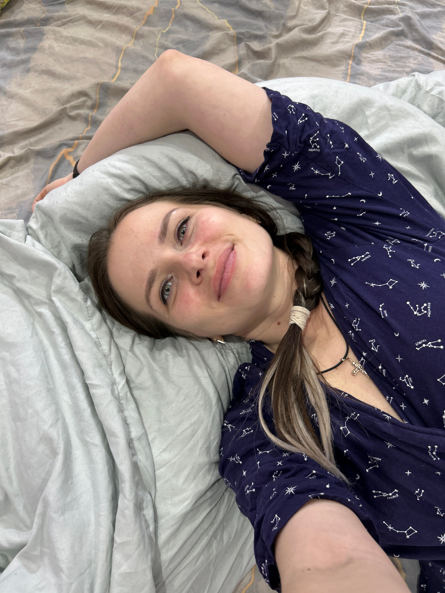 An overhead shot captures a person, likely a woman, lying on her back on a bed. Her head rests on a light grey pillow, and she is partially covered by a matching light grey duvet or comforter. To her…read more