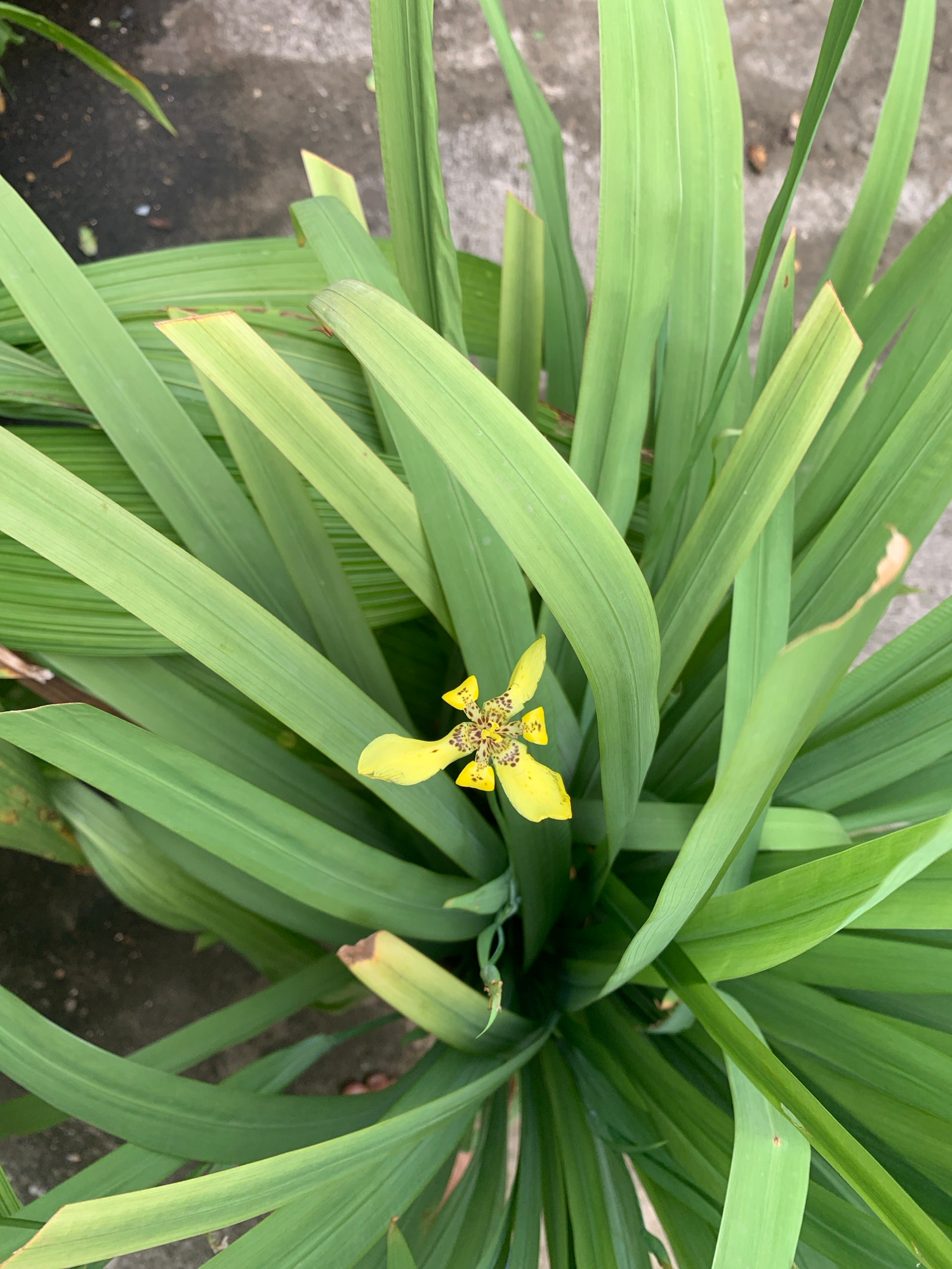 The image shows a plant with long, green, blade-like leaves. A single yellow flower with brown speckles is visible amongst the leaves. The environment appears to be outdoors, possibly in a garden or n…read more