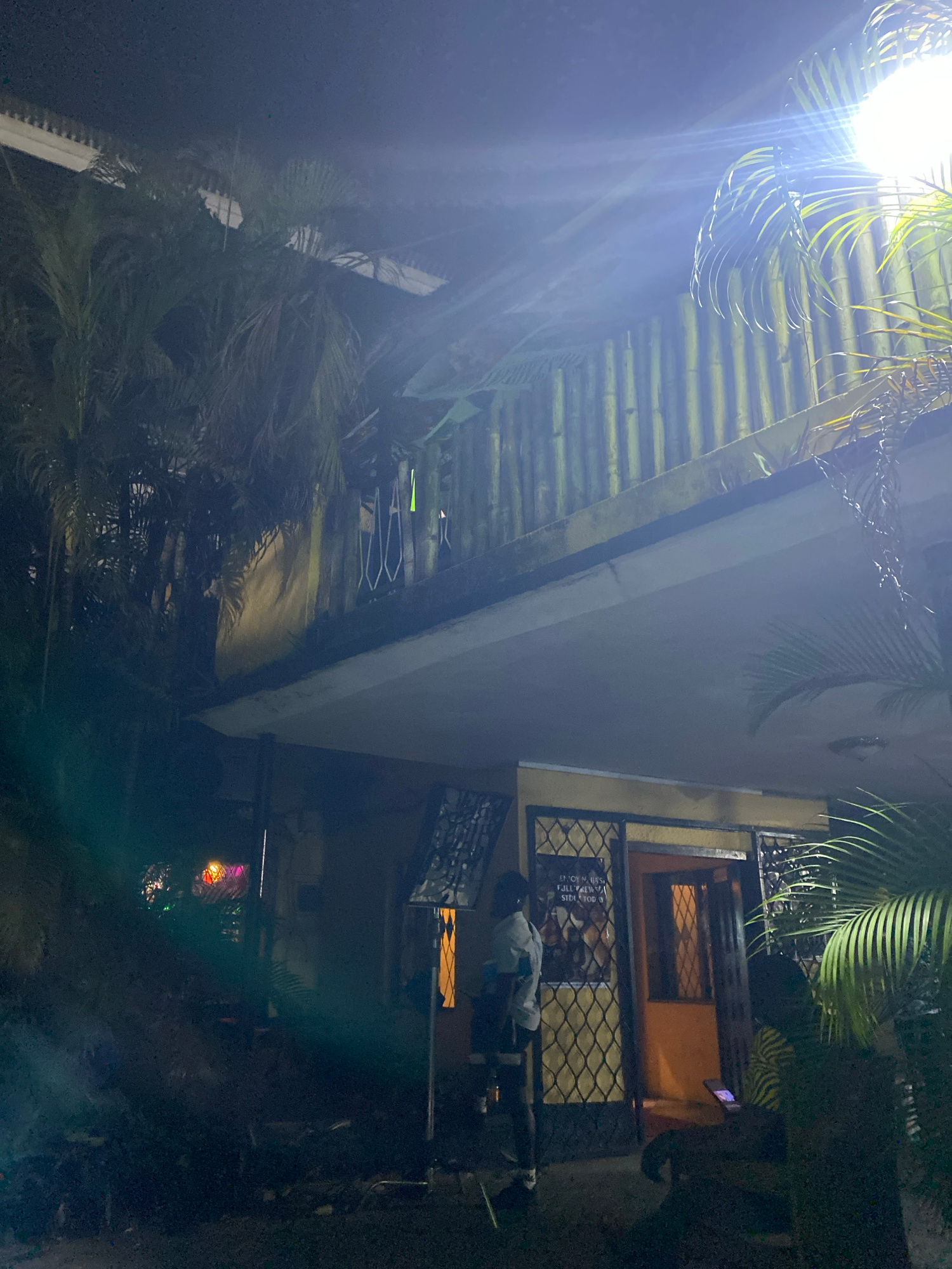 The image shows an outdoor scene at night in Lagos, Nigeria. A person is standing in front of a building with barred windows and a sign. The building is illuminated by a bright light. Palm trees are v…read more