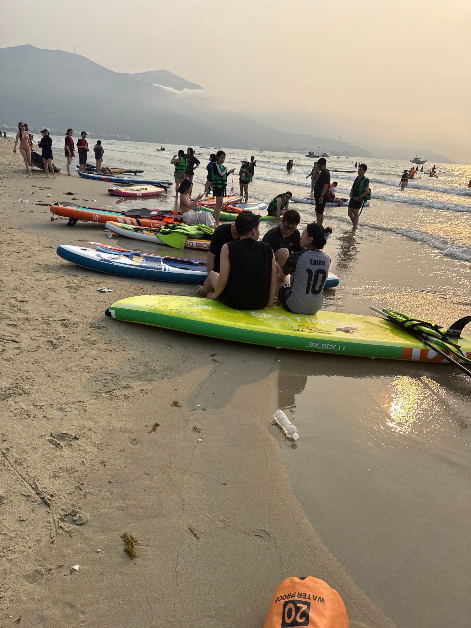 The image depicts a beach scene, likely at sunset given the hazy lighting conditions and low sun angle. The location is the coastal city of Đà Nẵng, Vietnam, indicated by the mountain visible in the b…read more