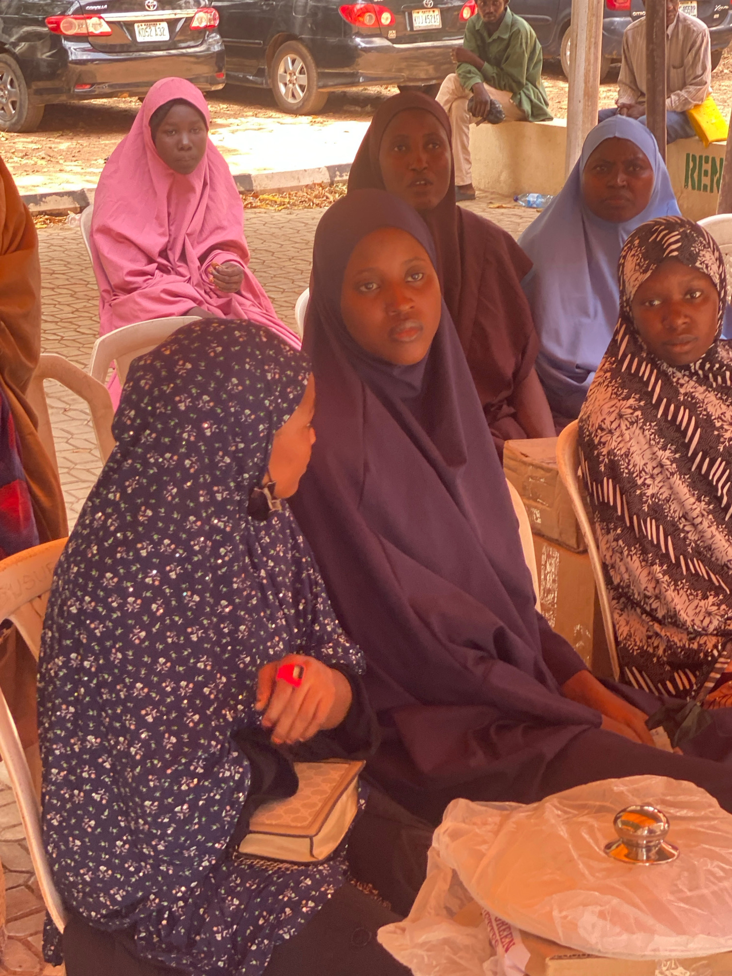 The image shows several people, primarily women, seated outdoors in Unguwar Rimi, Nigeria. They appear to be attending a gathering. All women are wearing hijabs and/or abayas of different colors and p…read more