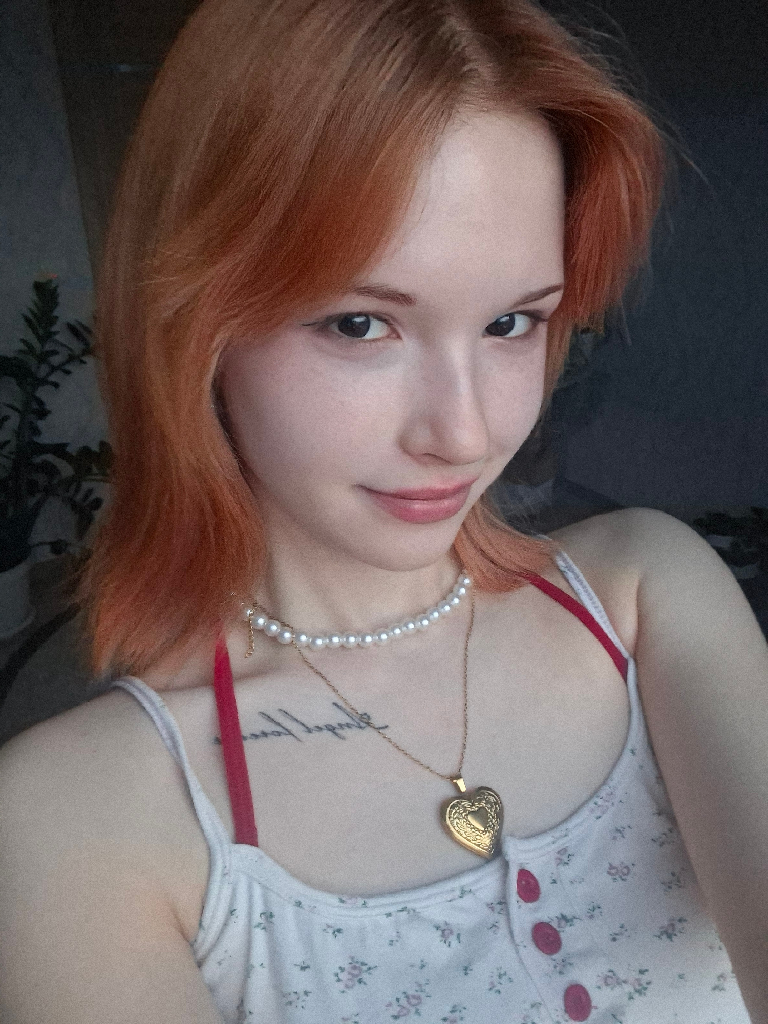 A close-up, rotated portrait features a young individual, likely female, with fair skin and vibrant reddish-orange hair. The person is positioned horizontally in the frame, looking directly at the cam…read more
