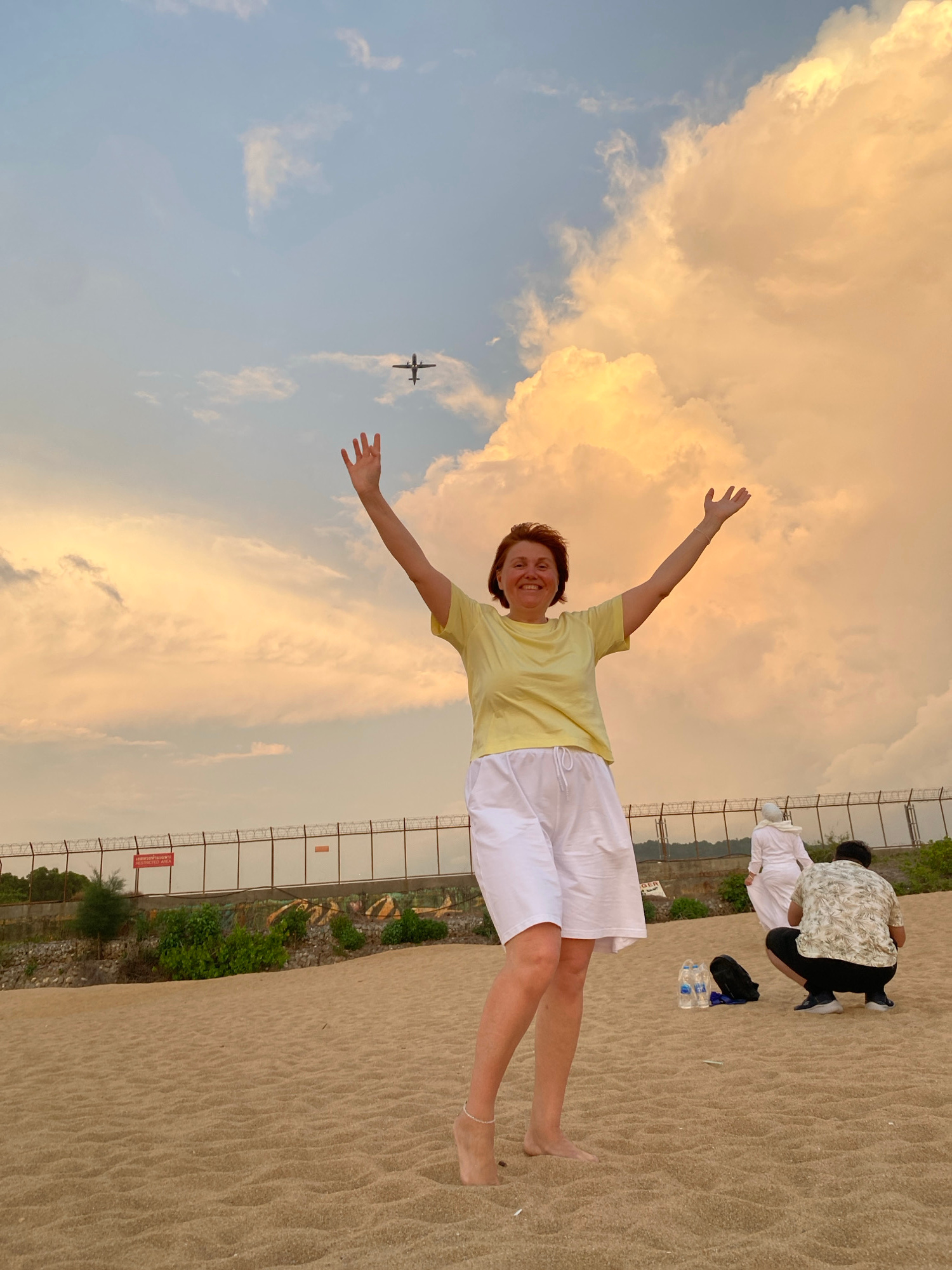 A rotated, eye-level, outdoor photo depicts a woman in a yellow t-shirt and white shorts standing barefoot on sand, with her arms outstretched. Behind her is a sky filled with sunset-colored clouds an…read more