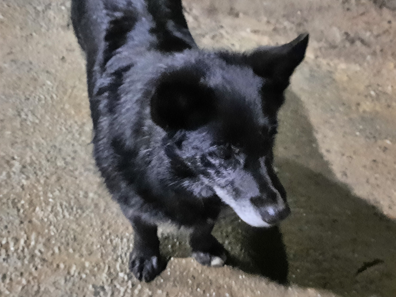 A black dog with a grey muzzle is standing on a sandy, textured surface. The dog is looking downward, with one ear perked up. The scene is dimly lit, and the dog casts a shadow. The location is not id…read more