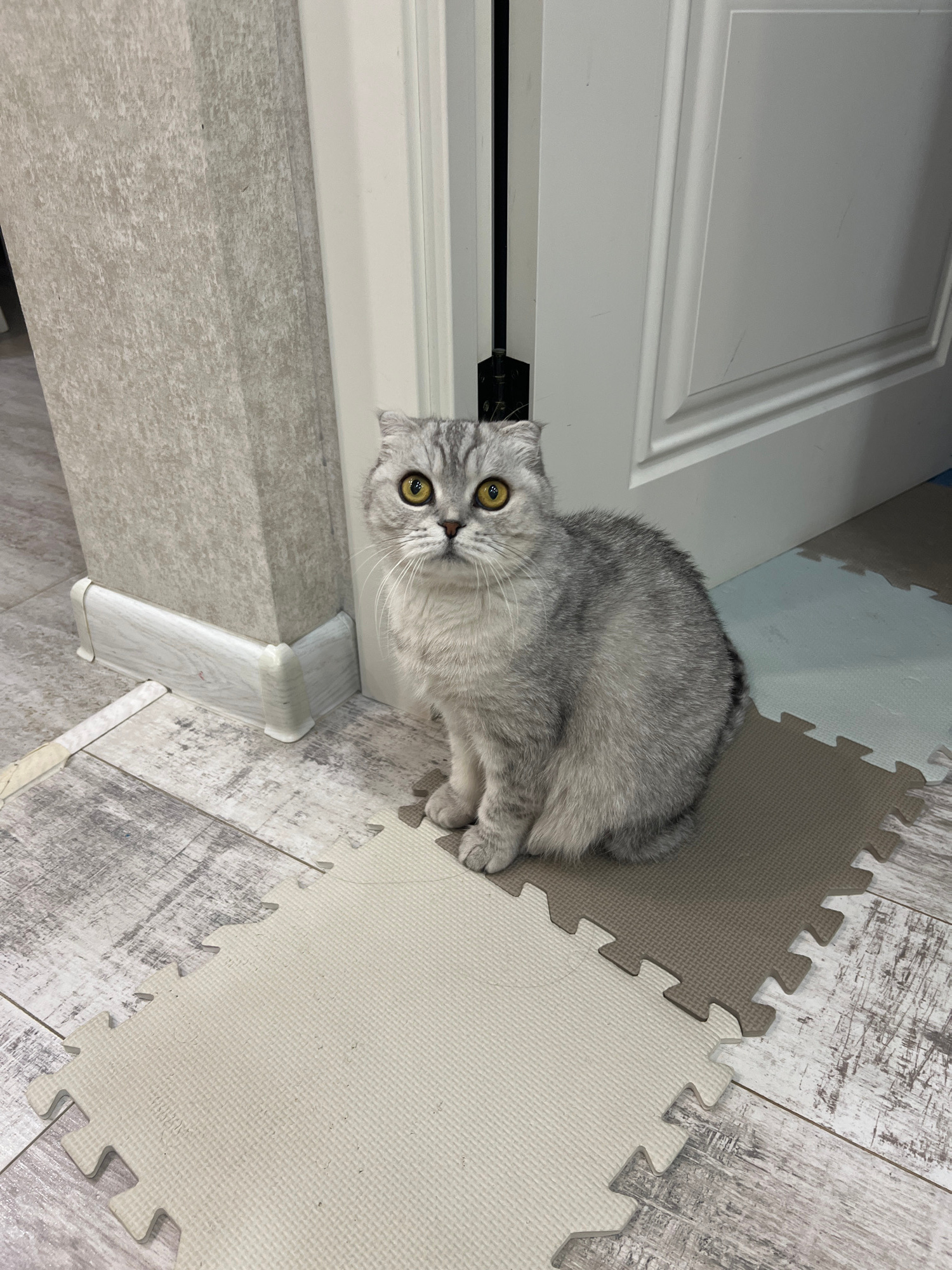 A fluffy, silver-gray tabby cat with distinctively folded ears and wide, alert yellow-green eyes is captured in an indoor setting. The cat is the central subject, looking directly at the viewer with a…read more