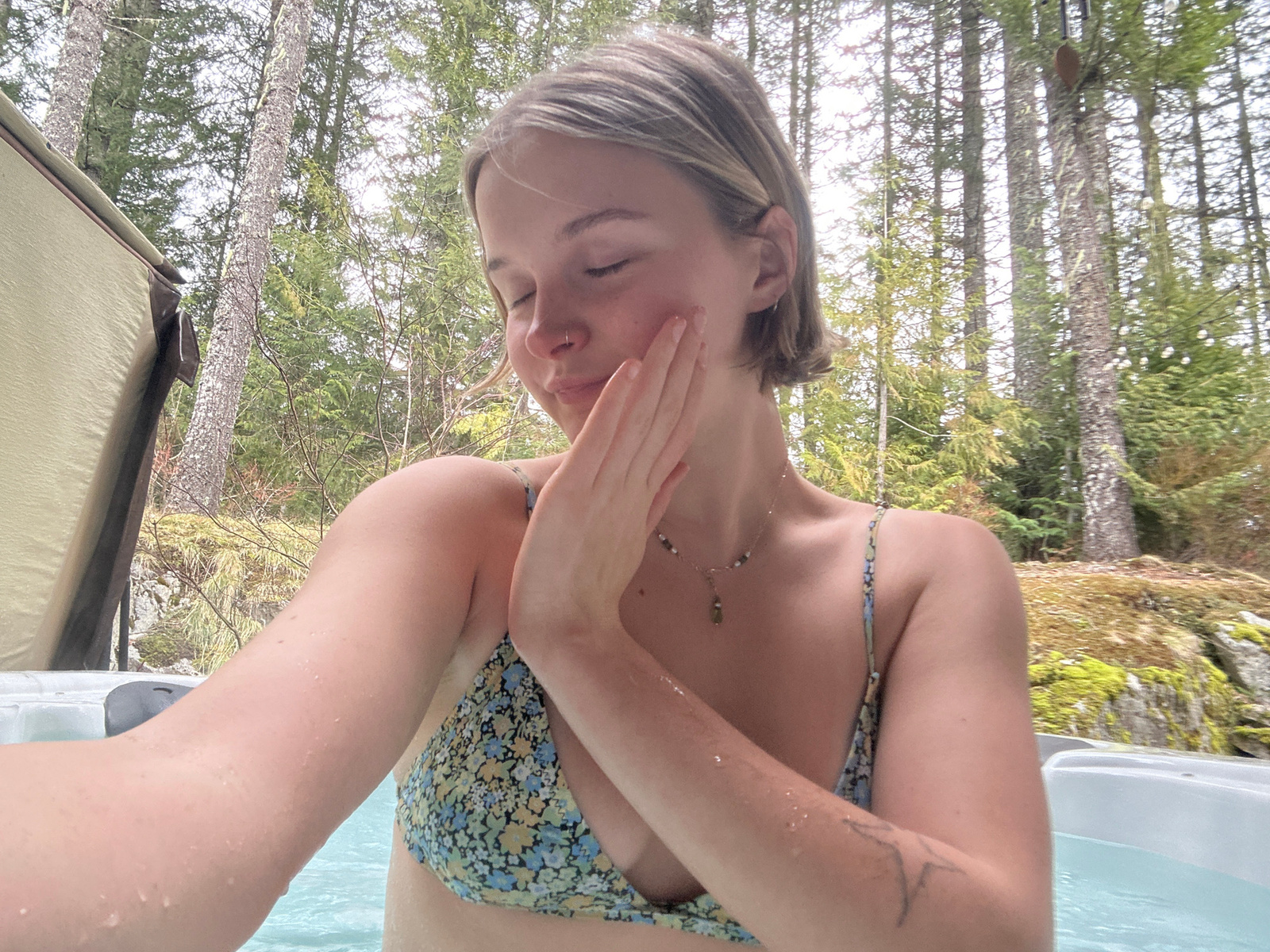 The image depicts a young adult female immersed in a hot tub within a forested outdoor setting, consistent with the natural environment of Whistler, Canada. The subject, a female with short, light br…read more