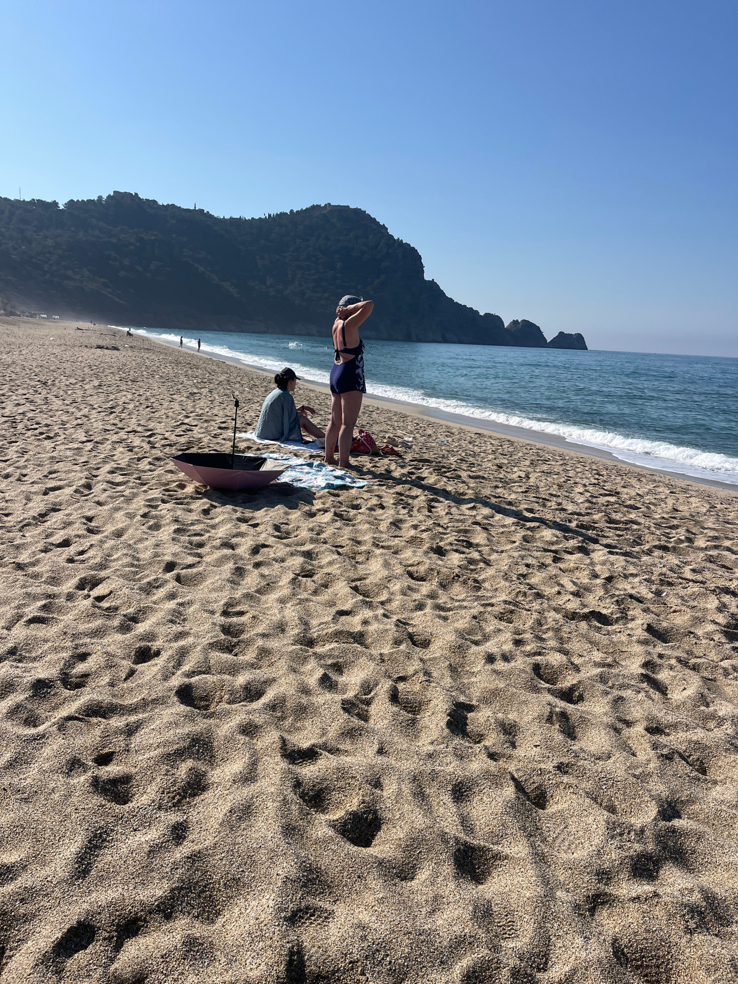The image shows a beach scene in Alanya, Turkey. A woman in a bathing suit stands on a towel laid out on the sand, near the shoreline. Another person sits nearby. An umbrella is also visible. The sand…read more