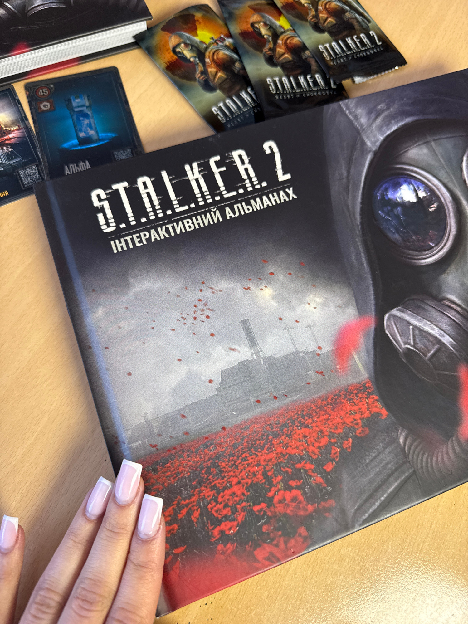 On a light brown surface, a book titled "S.T.A.L.K.E.R. 2" in bold, black lettering is the primary object. The cover features a close-up image of a gas mask with red and white abstract patterns. To th…read more