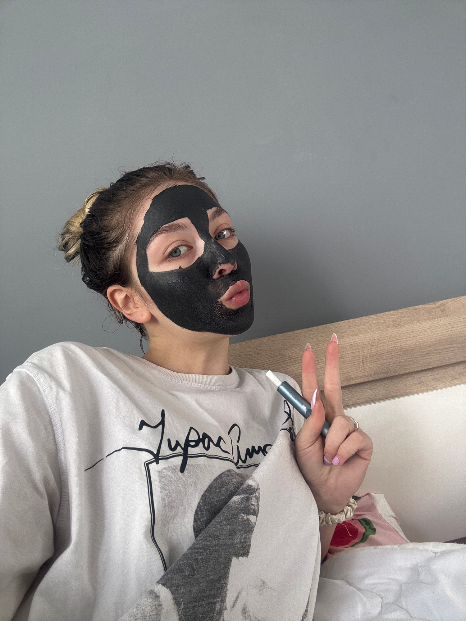A young woman wearing a black face mask poses indoors. She is holding a blue cylindrical device in her left hand, making a peace sign with her fingers. She is wearing a white sweatshirt and a scrunchi…read more