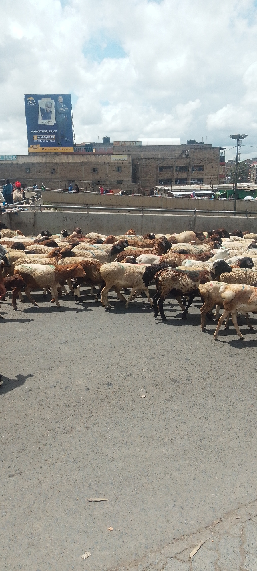 The image depicts a large flock of sheep crossing a street in Nairobi, Kenya. The animals are of varying colors, including white, brown, and black. In the background, buildings and a large billboard f…read more