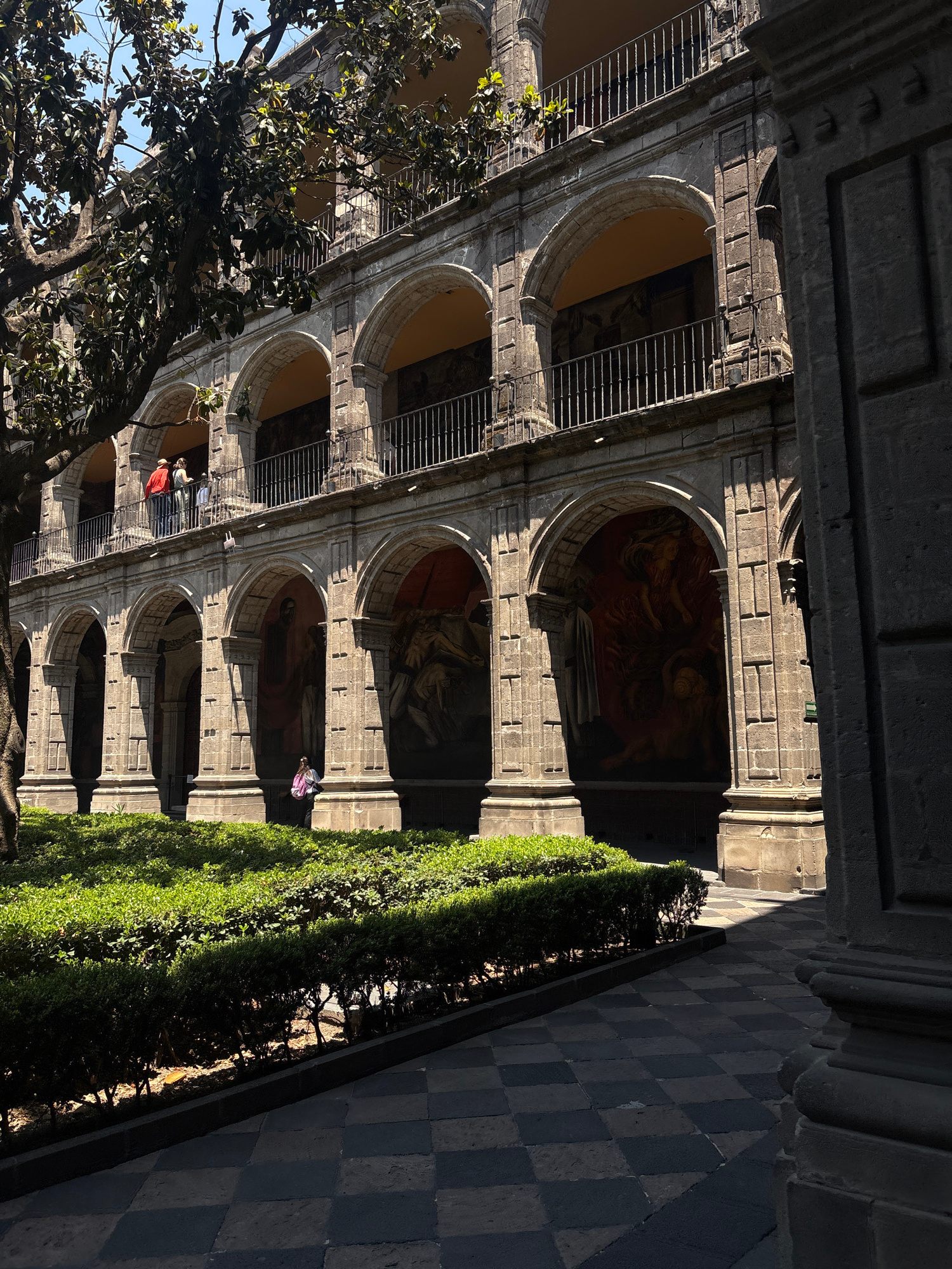 Here is a description of the image: The image shows the Palacio Nacional (National Palace) in Mexico City, Mexico. The building has a facade with multiple arches, each containing frescoes. Some of thβ¦read more