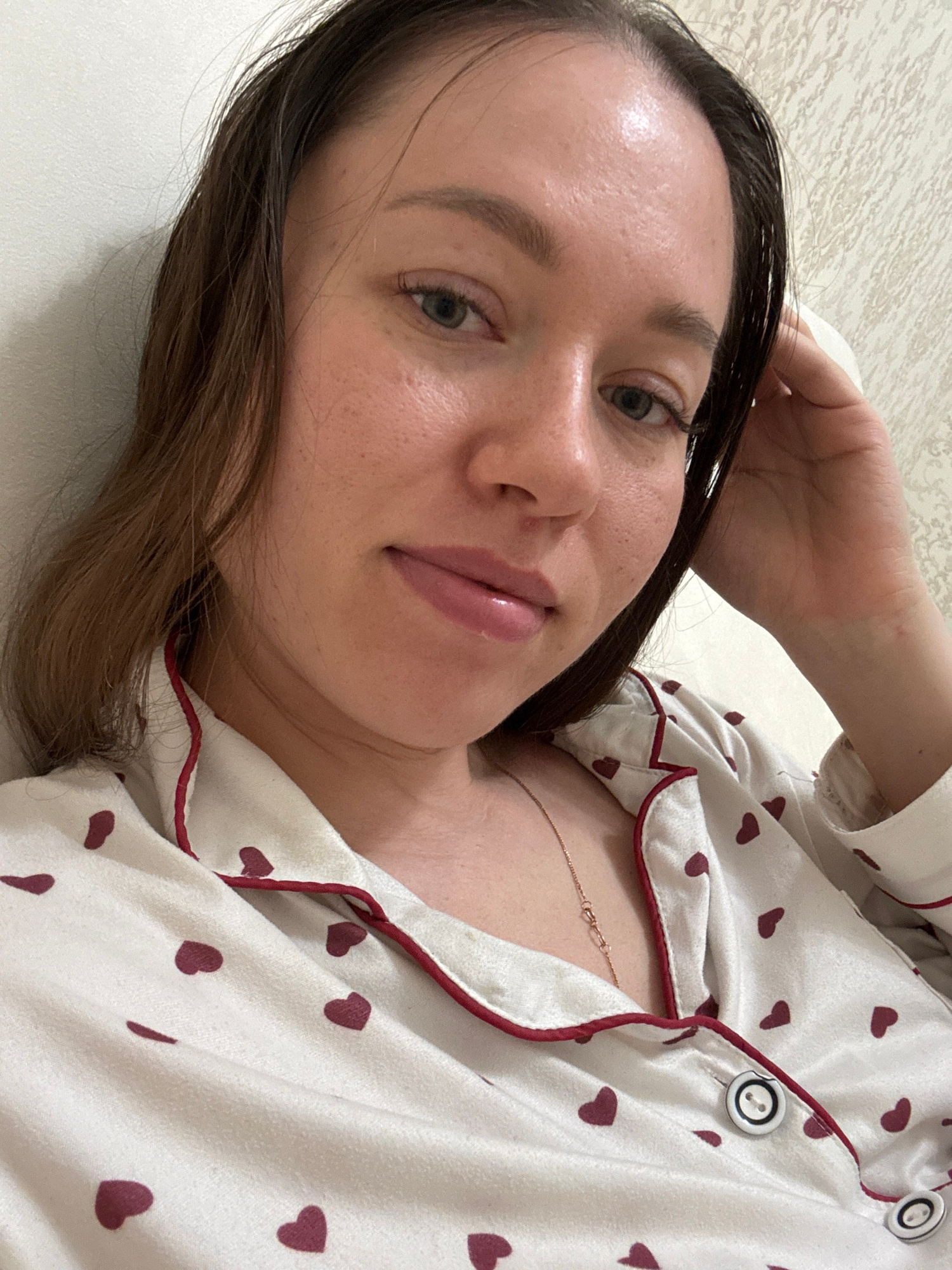 A woman is lying on a light-colored surface, possibly a bed, wearing a white pajama top with red heart patterns and red piping. Her dark hair is slightly damp, and she is looking at the camera. A gold chain necklace is visible around her neck. The location is Ферма, Russia. | Open Wire