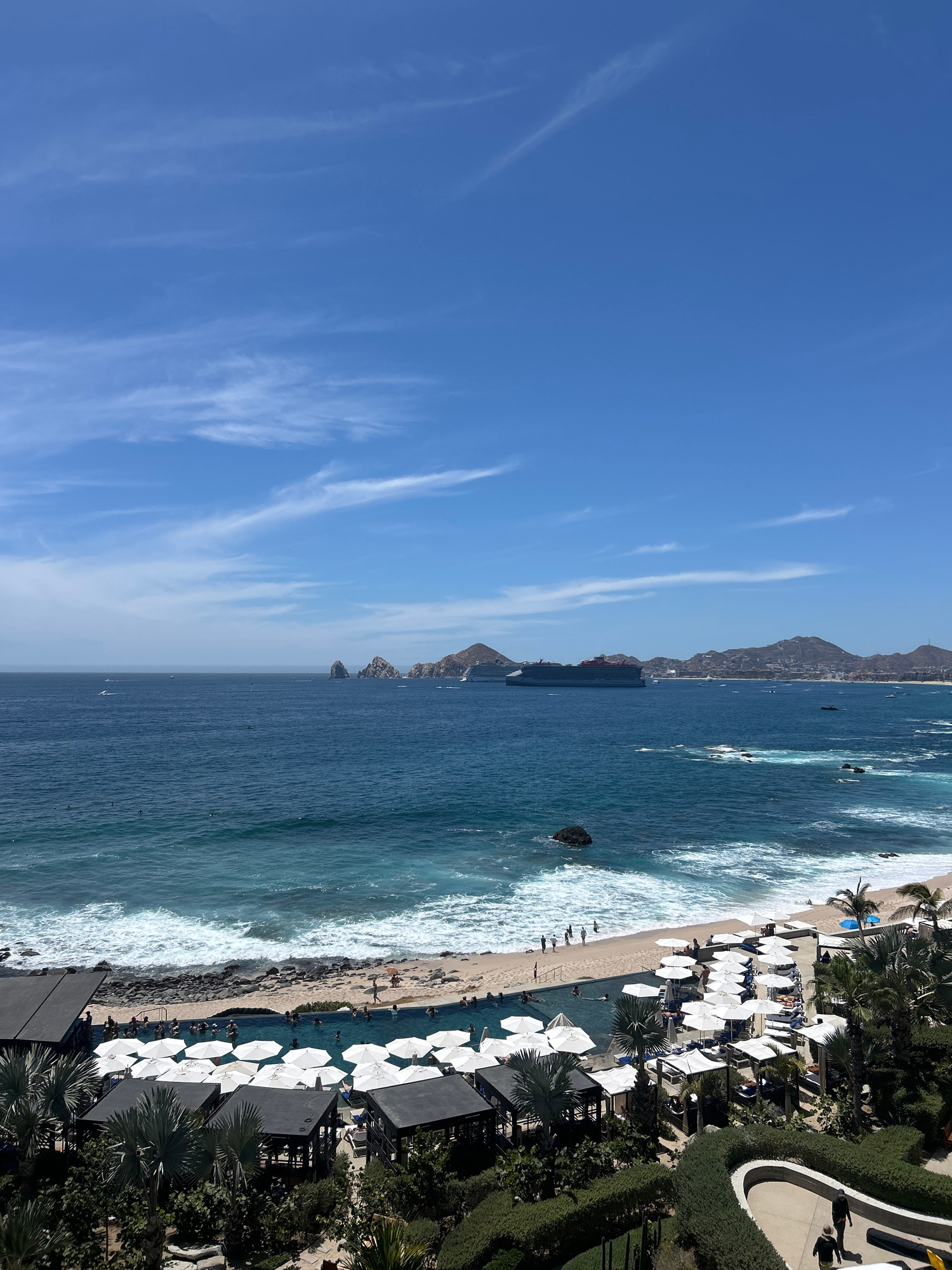 The image depicts an aerial view of a beach in Cabo San Lucas, Mexico. The scene is rotated 90 degrees clockwise. The sky is blue with thin, wispy clouds. The ocean extends from the shoreline to the h…read more