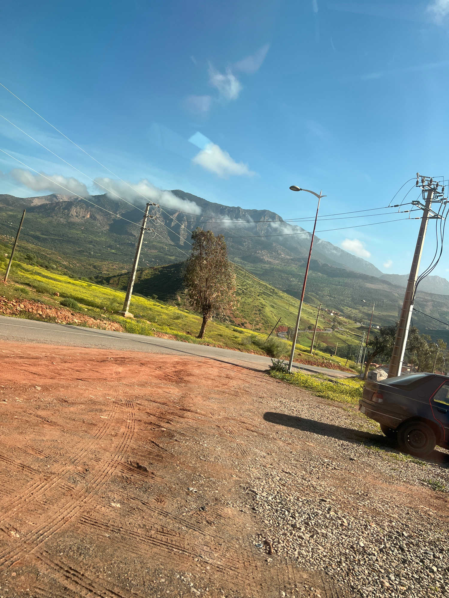 The image shows a scene near Ouaouizert, Morocco. The foreground features a dirt and gravel road with tire tracks. A portion of a dark-colored vehicle is visible on the right side of the frame. Beyond…read more