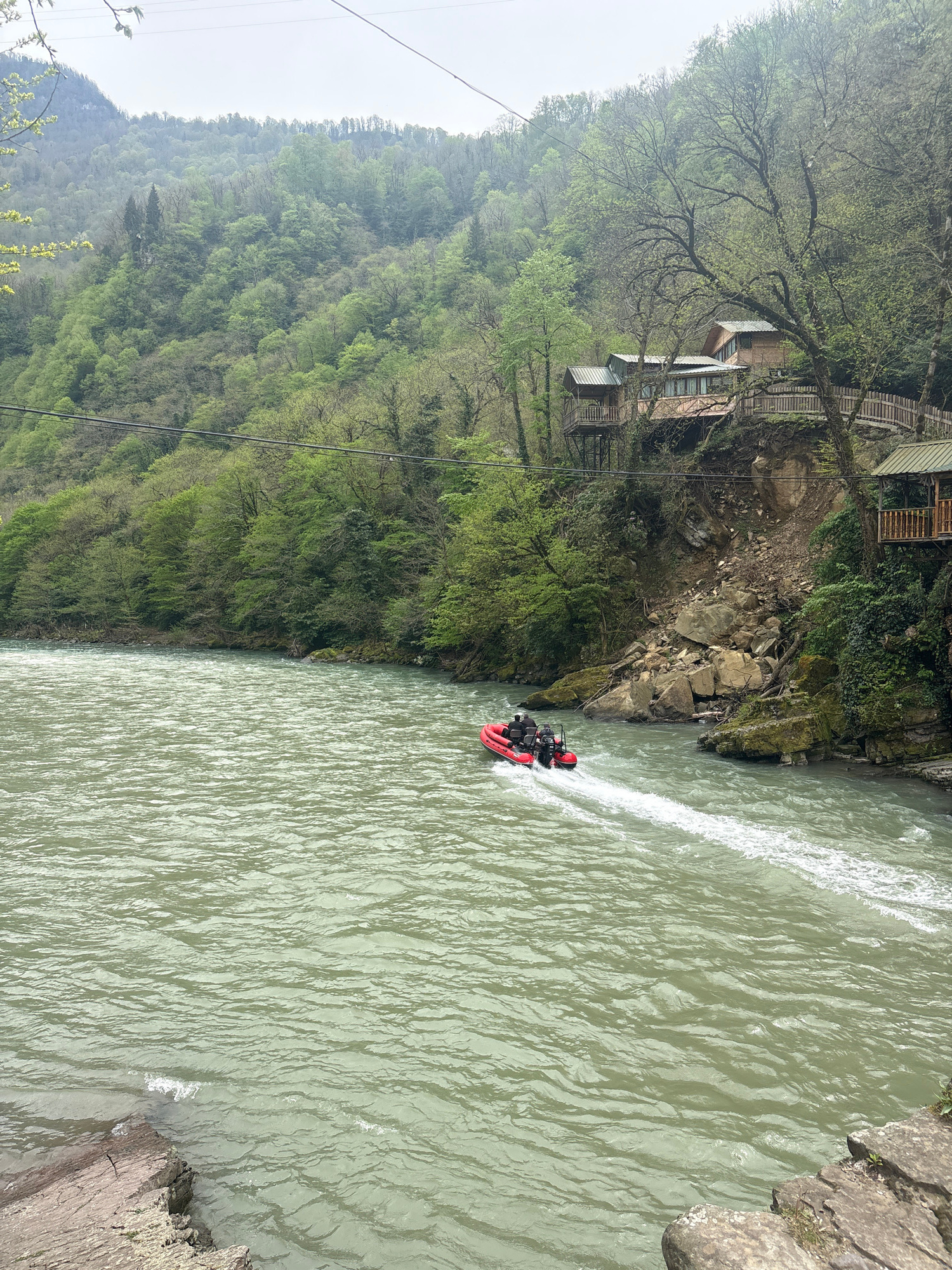 The image shows a red inflatable boat in a river at Kveda Makhuntseti, Georgia. The boat is traveling rapidly through the water, creating a white wake behind it. On the left bank of the river, there's…read more