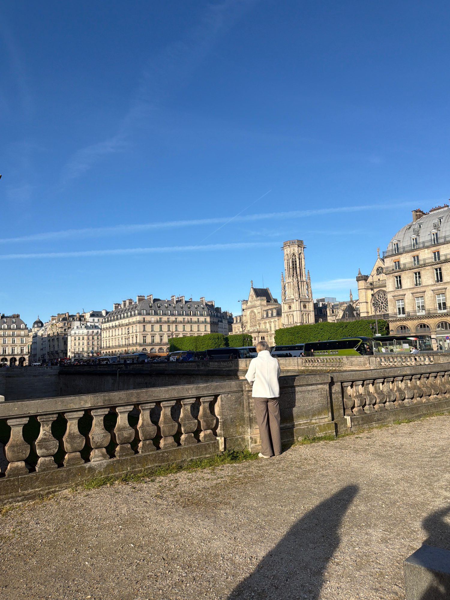 The image shows a view in Paris, France, with architectural elements suggesting a position overlooking a cityscape. A clear blue sky is visible. Buildings line the street. A person is standing near a…read more