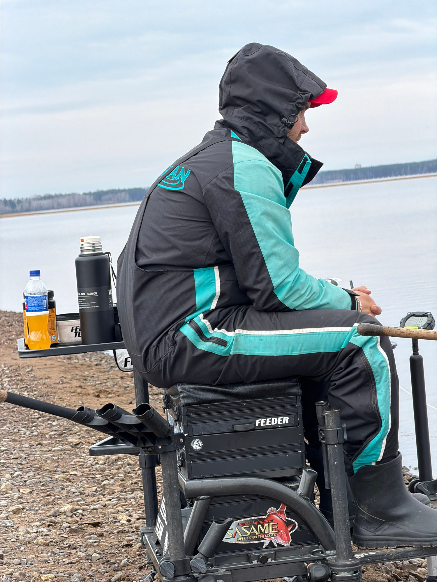 The image shows a person sitting in a fishing chair on the shore of a body of water, possibly the Kama Reservoir. The person is wearing a dark jacket with teal accents and a red cap, their face partiaβ¦read more
