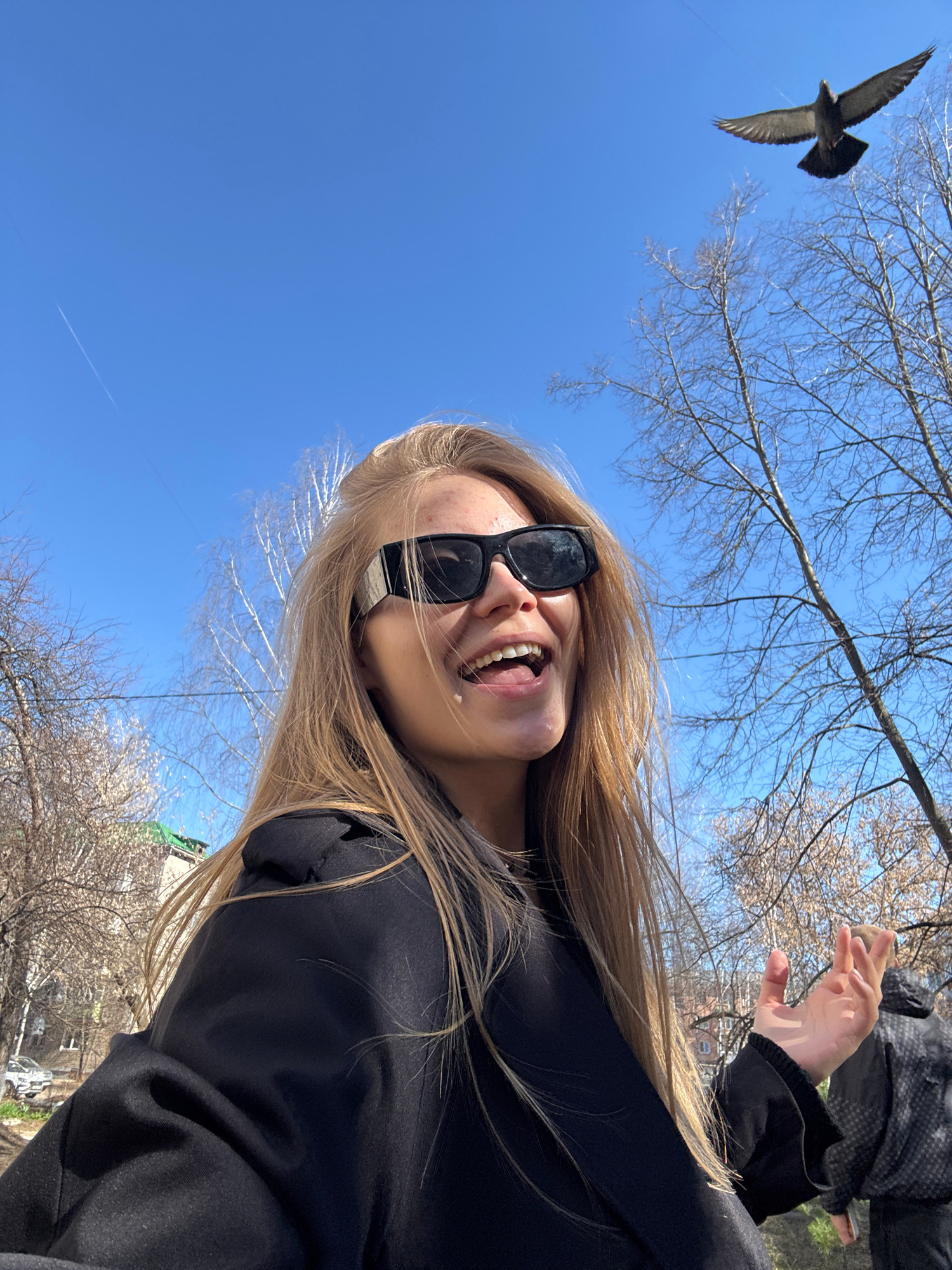 The image shows a selfie of a fair-skinned person with long blonde hair, wearing black sunglasses and a black sweatshirt. The person is smiling with their mouth open. Above and to the left, a bird is…read more