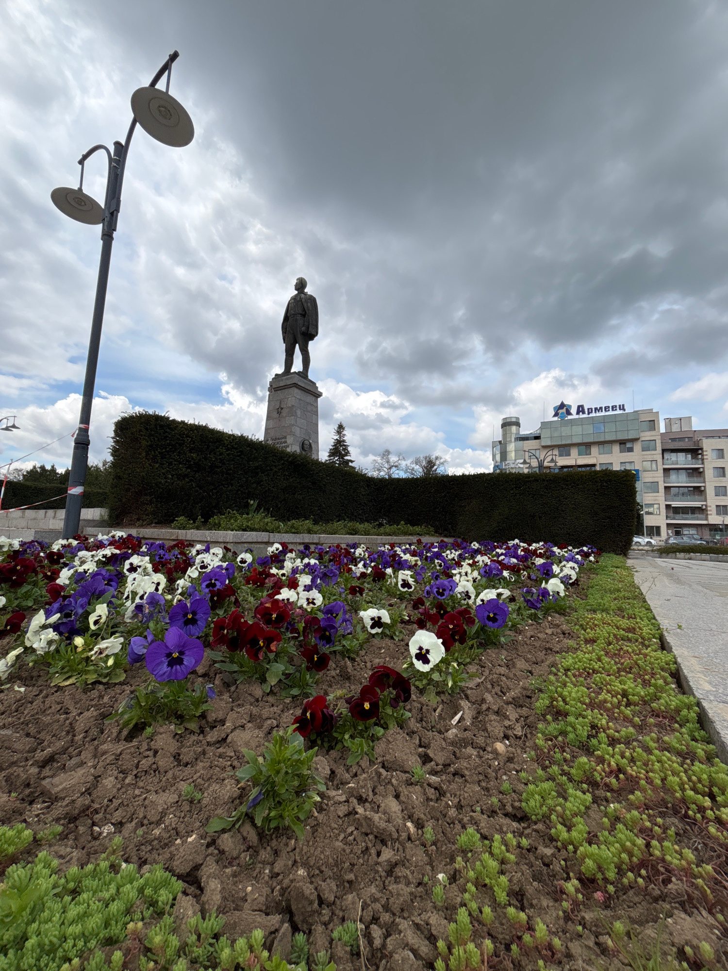 The image shows a flower bed with purple, red, and white pansies in the foreground. Adjacent to the flowers is a patch of green ground cover. Behind the flower bed is a tall, manicured hedge. A bronze…read more
