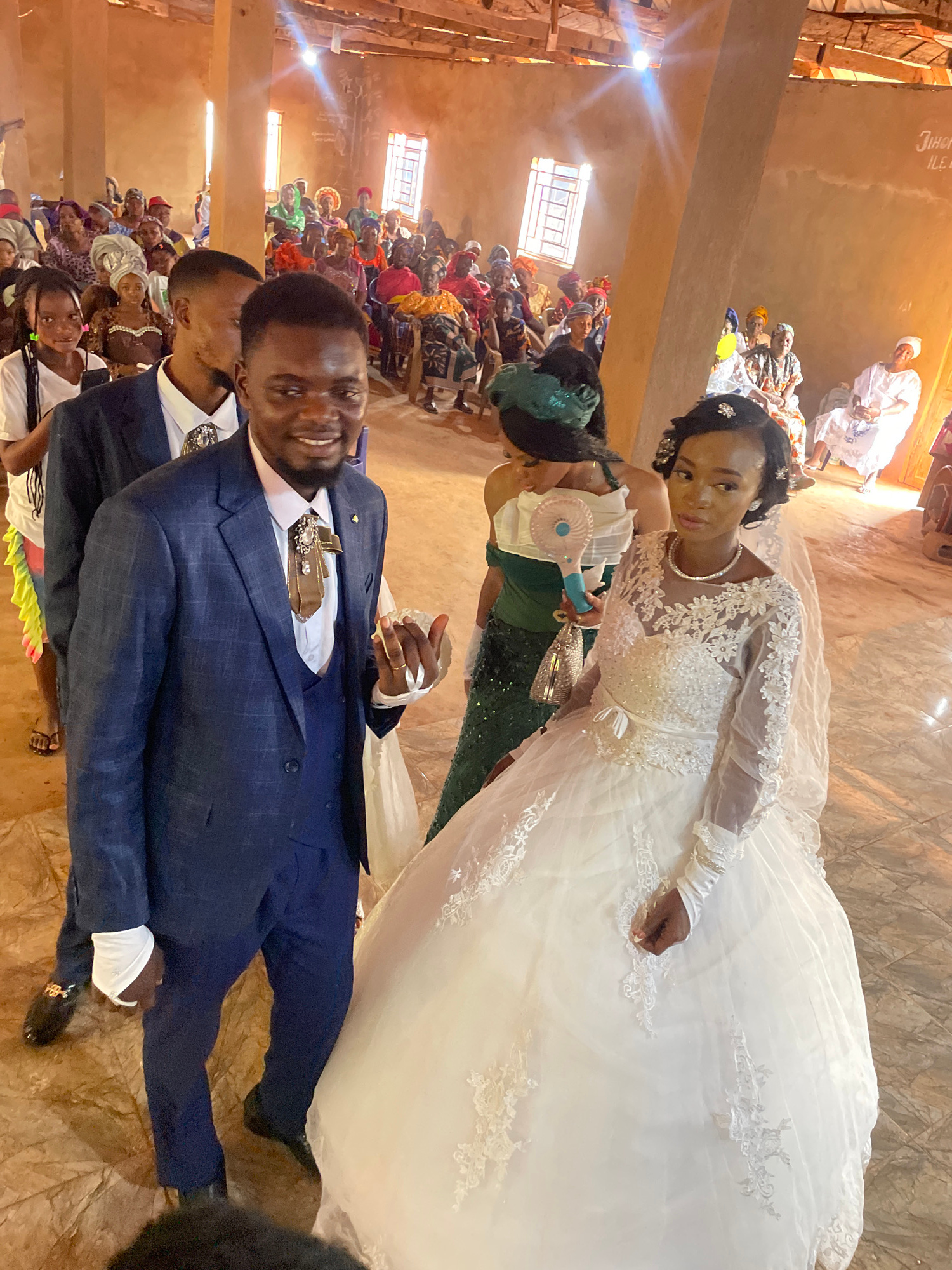 A photograph captures a wedding scene, likely in a church in Ogbe, Nigeria. The bride is adorned in a white gown with lace detailing. She wears a necklace and has hair accessories. The groom is dresse…read more