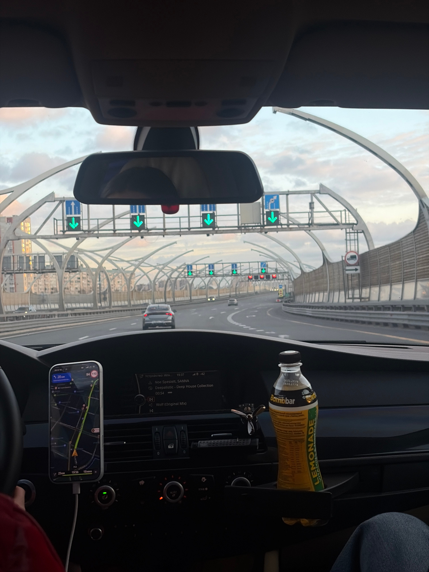 Captured from the interior of a vehicle, the image presents a forward-facing view of the Western High-Speed Diameter (WHSD), a toll highway in Saint Petersburg, Russia. The driver's perspective encompβ¦read more