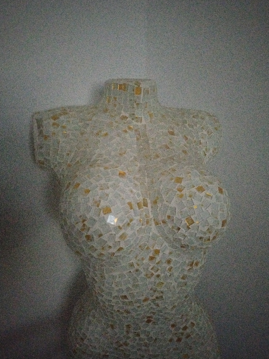 A mosaic torso sculpture rests against a pale wall. The mosaic consists of small, irregular white tiles with subtle gold flecks interspersed throughout. The sculpture is stylized, depicting the upperβ¦read more