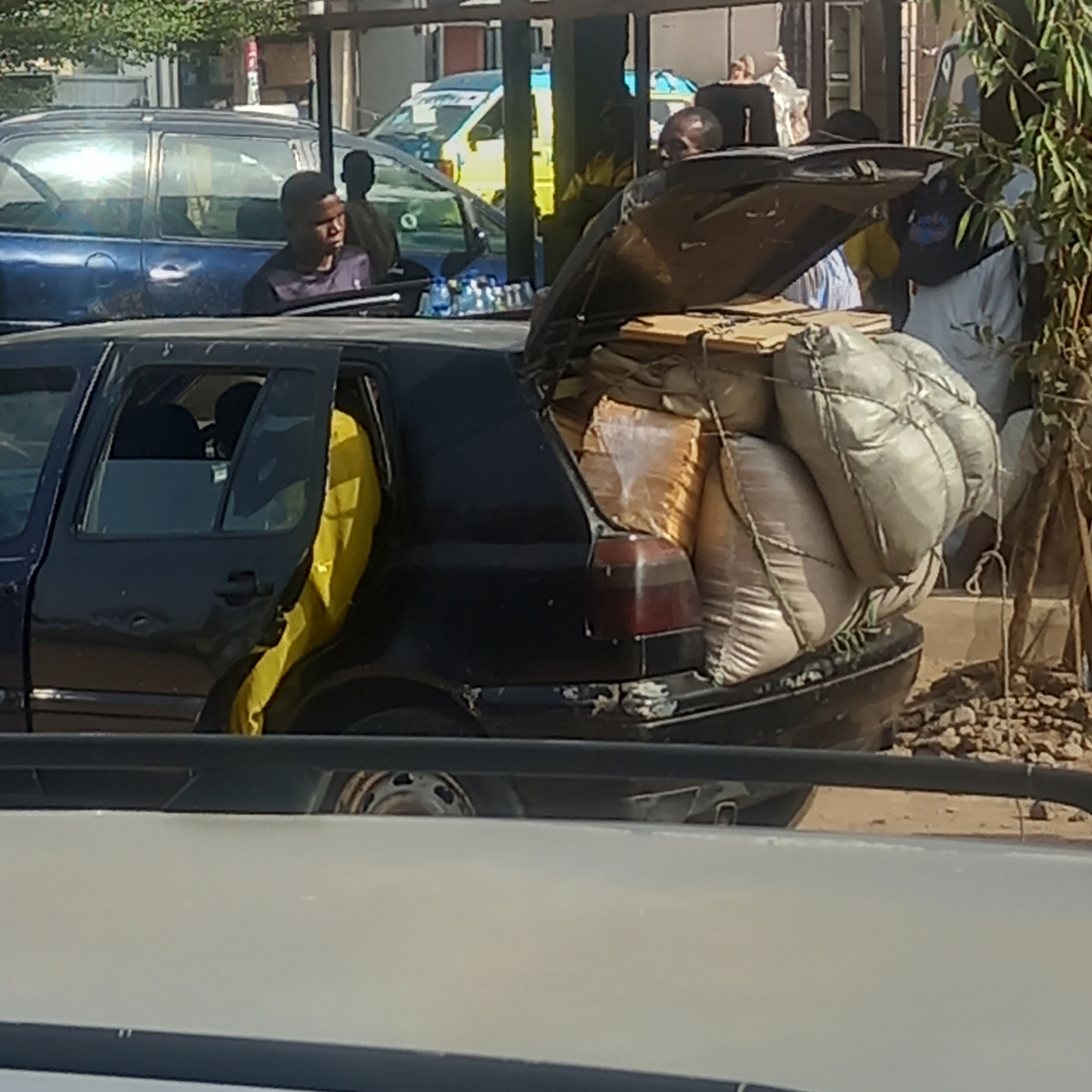 In Dadi Riba, Nigeria, a dark blue hatchback is overloaded with multiple large, white sacks secured with rope in the open trunk. The driver, a Black man, leans out of the driver's side window. A yello…read more