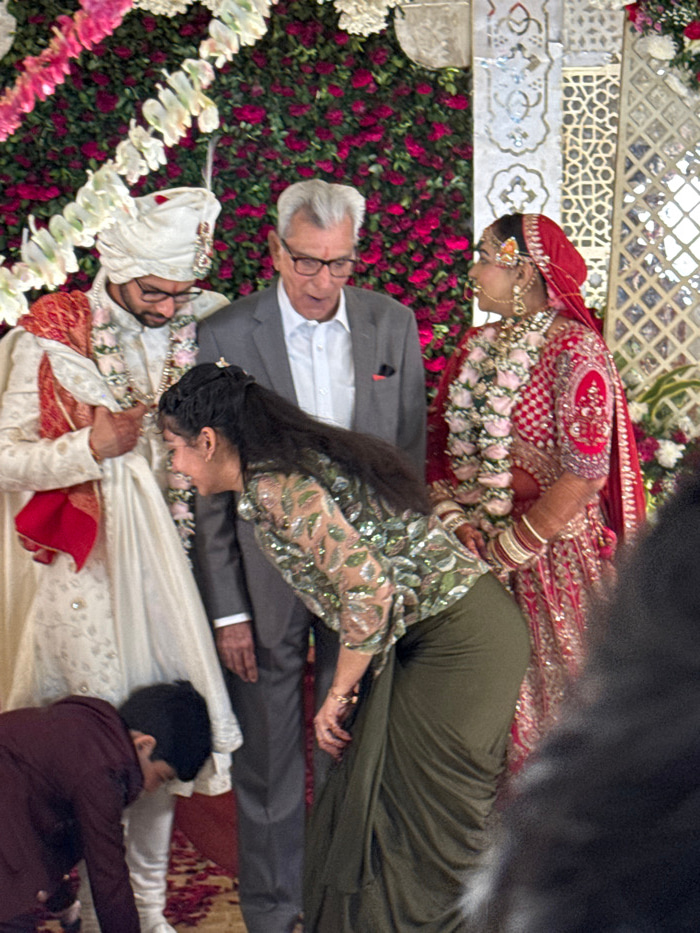 The image captures a vibrant and intimate moment from what appears to be an Indian wedding ceremony, viewed from a slightly elevated perspective. The scene is rich with traditional attire, floral deco…read more