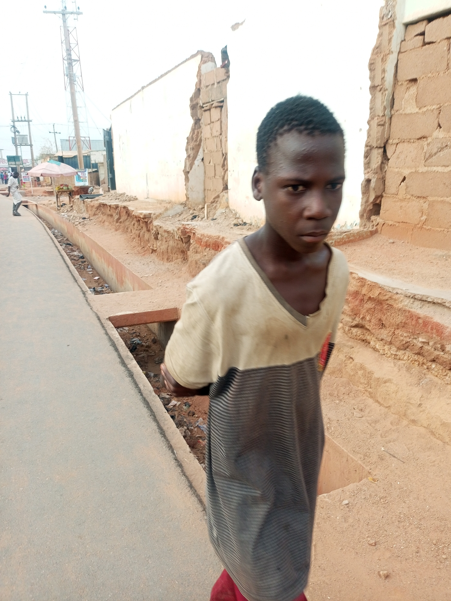 A close-up shot of a dark-skinned, slender child is located on a street in Timia, Niger, with a damaged building in the background. The child, dressed in a dirty, striped shirt, is facing the camera w…read more