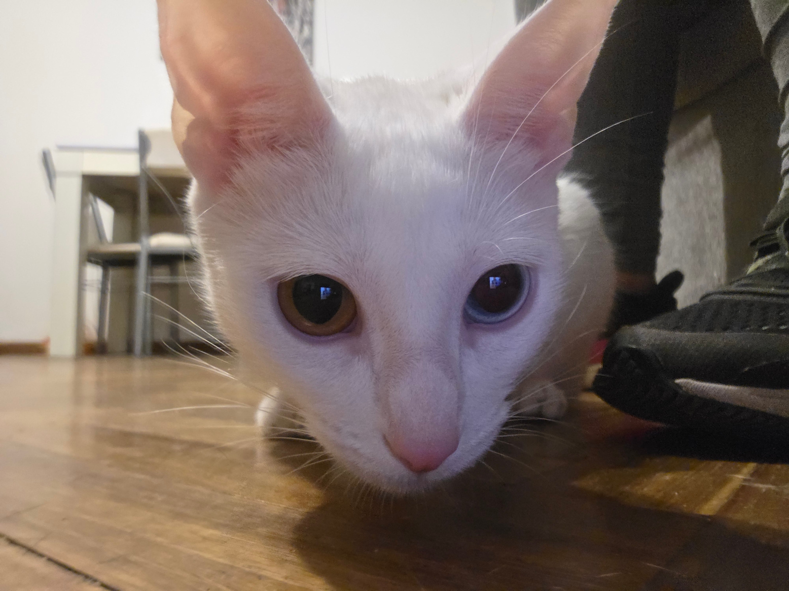 The image depicts a white domestic feline, identifiable by its pointed ears and slender facial structure, positioned low to the ground and facing directly forward. The cat exhibits heterochromia, with…read more