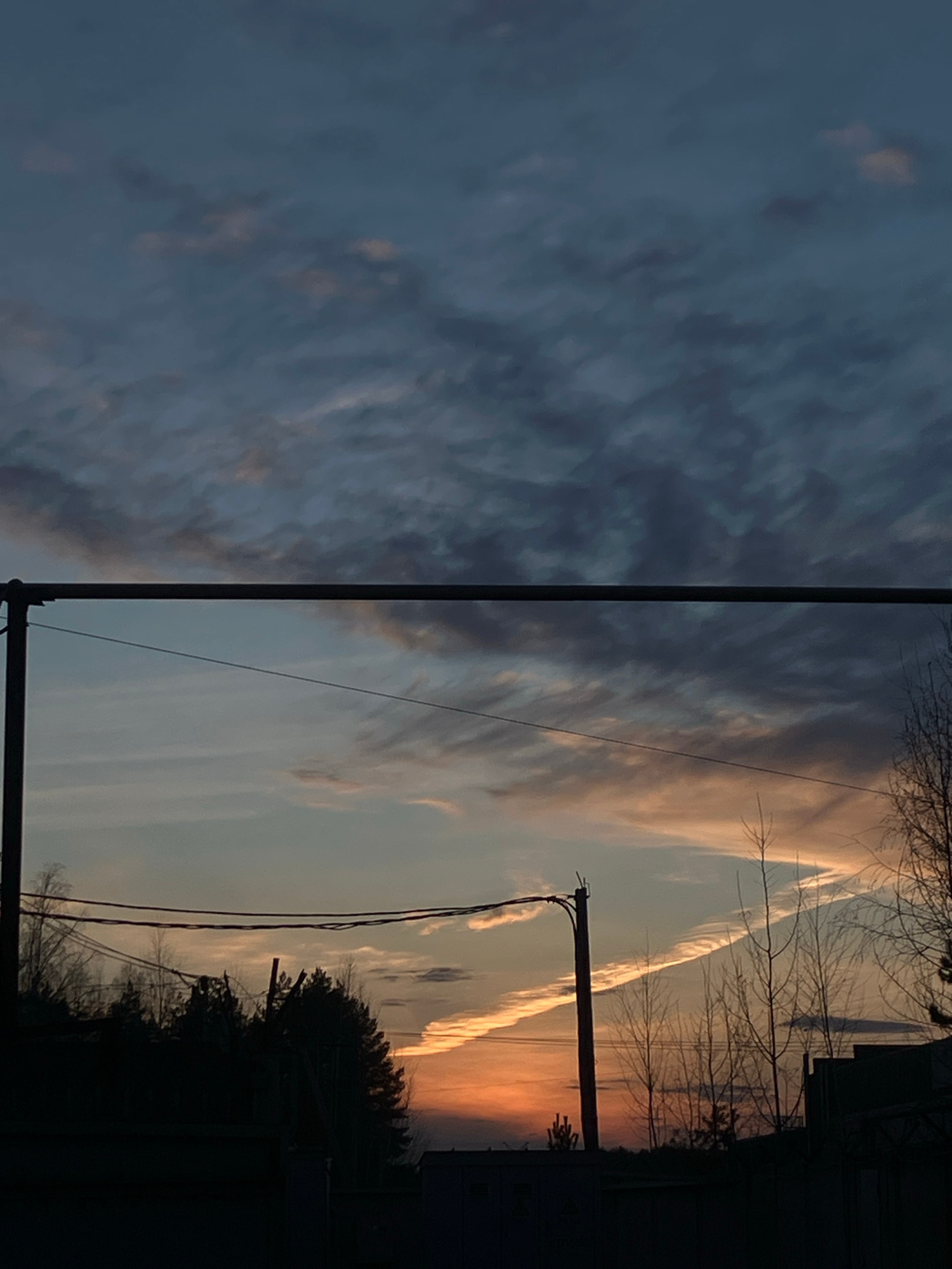 The image captures a view of the sky, bisected vertically by a utility pole. The left side of the frame shows a predominantly gray, overcast sky with scattered cloud formations. The right side of the…read more