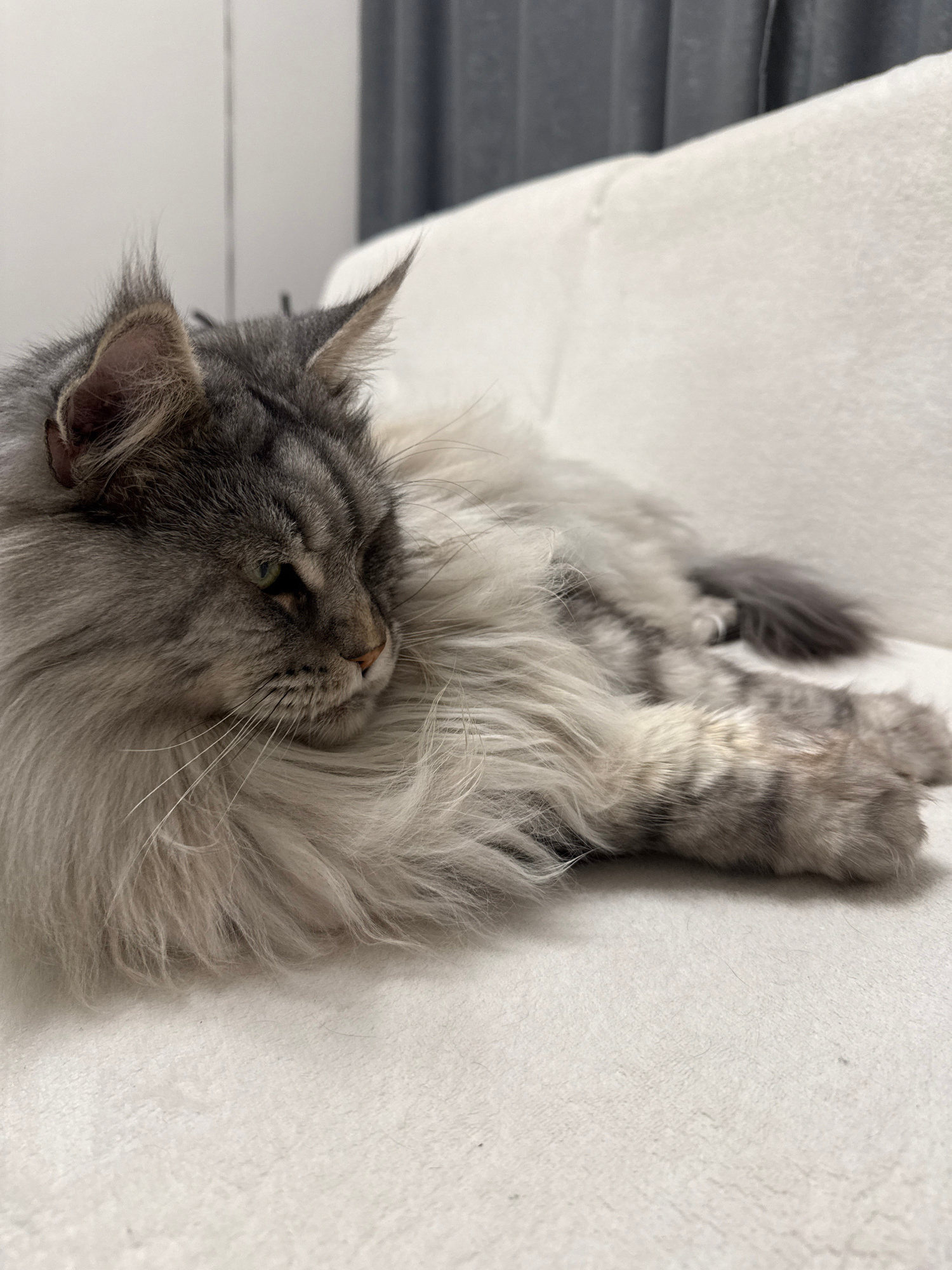 A gray tabby cat with long fur lies on its back on a white fabric surface. The cat's head is in the lower left of the image, while its paws are near the top right. A gray metal structure is visible in…read more