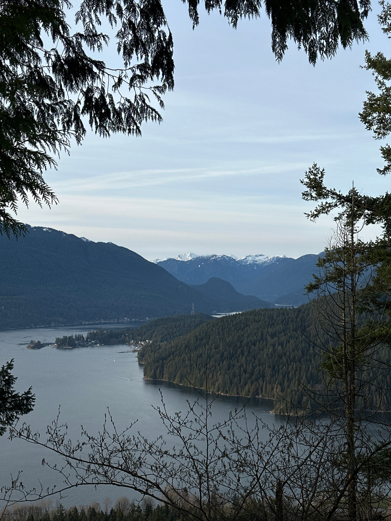 The image depicts a mountainous landscape with a lake, framed by trees. The lake appears to stretch between the mountains, and there may be some buildings or houses on its shores. In the background, t…read more