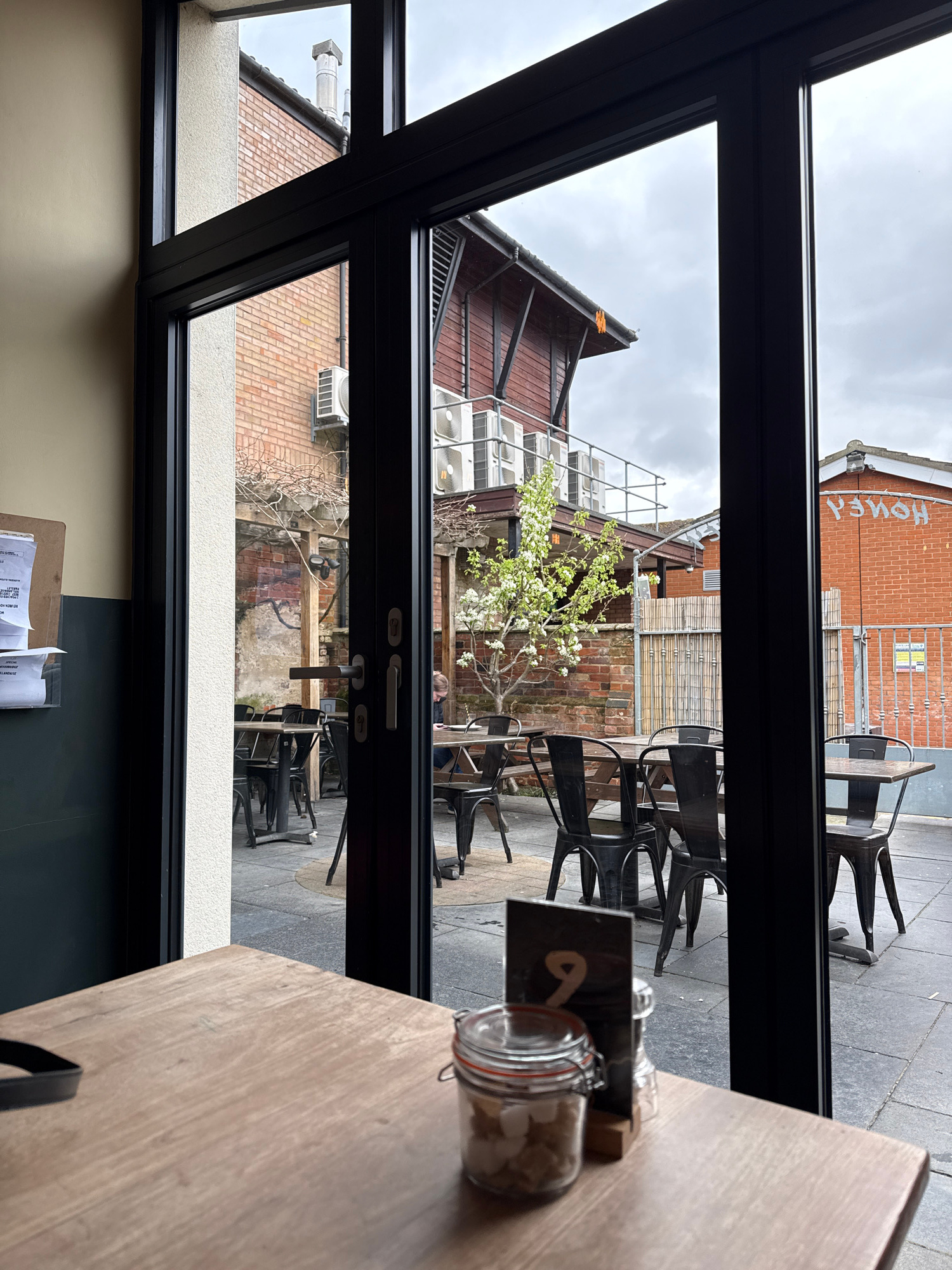The image is taken from an indoor vantage point, looking out through a black-framed window. The scene presents an outdoor patio area. Outside, there are multiple metal chairs and tables arranged, sugg…read more