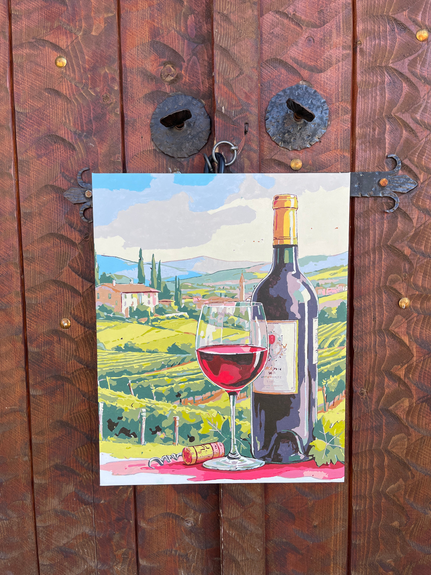 A painted canvas depicting a wine bottle and glass in a vineyard landscape is attached to a textured, wooden door. The door has two metal escutcheons, a hinge and a metal clasp. A keyring hangs from o…read more