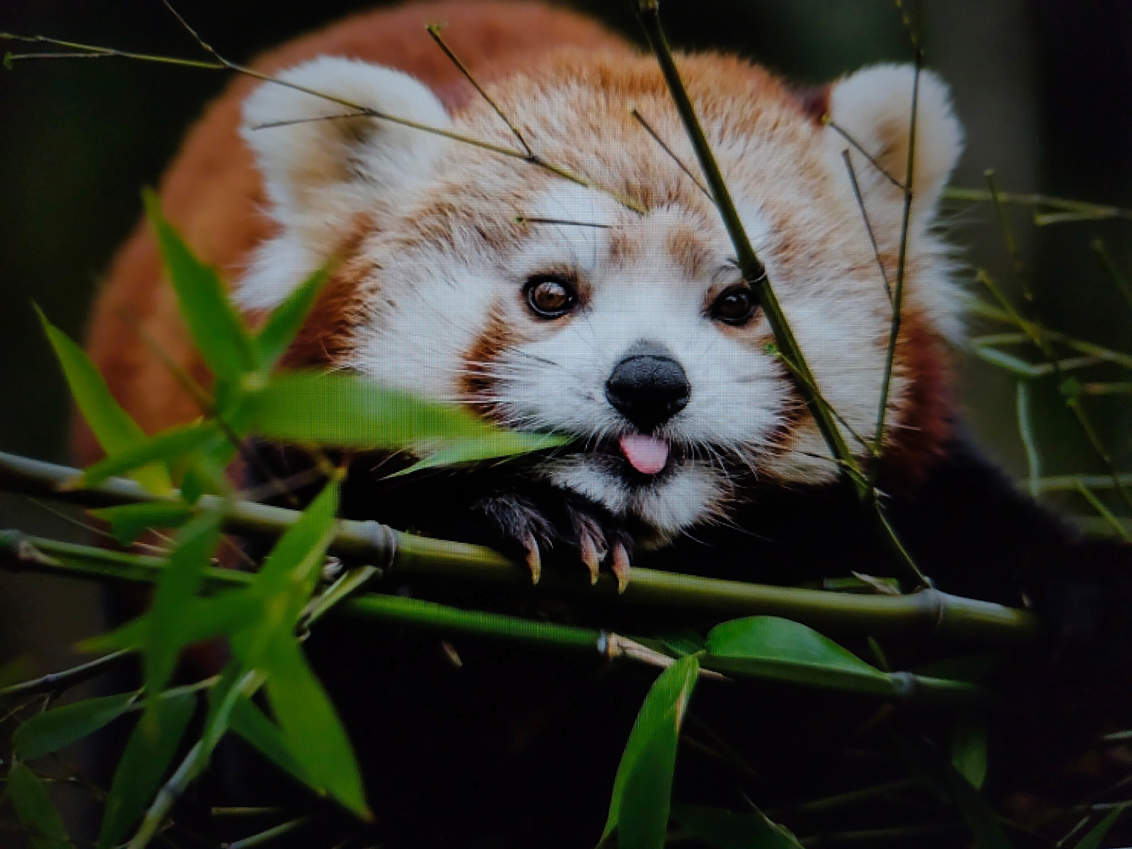A close-up image shows a red panda peering through green bamboo branches. The panda has reddish-brown fur on its head and back, with white fur around its ears and muzzle. It has a small, black nose an…read more