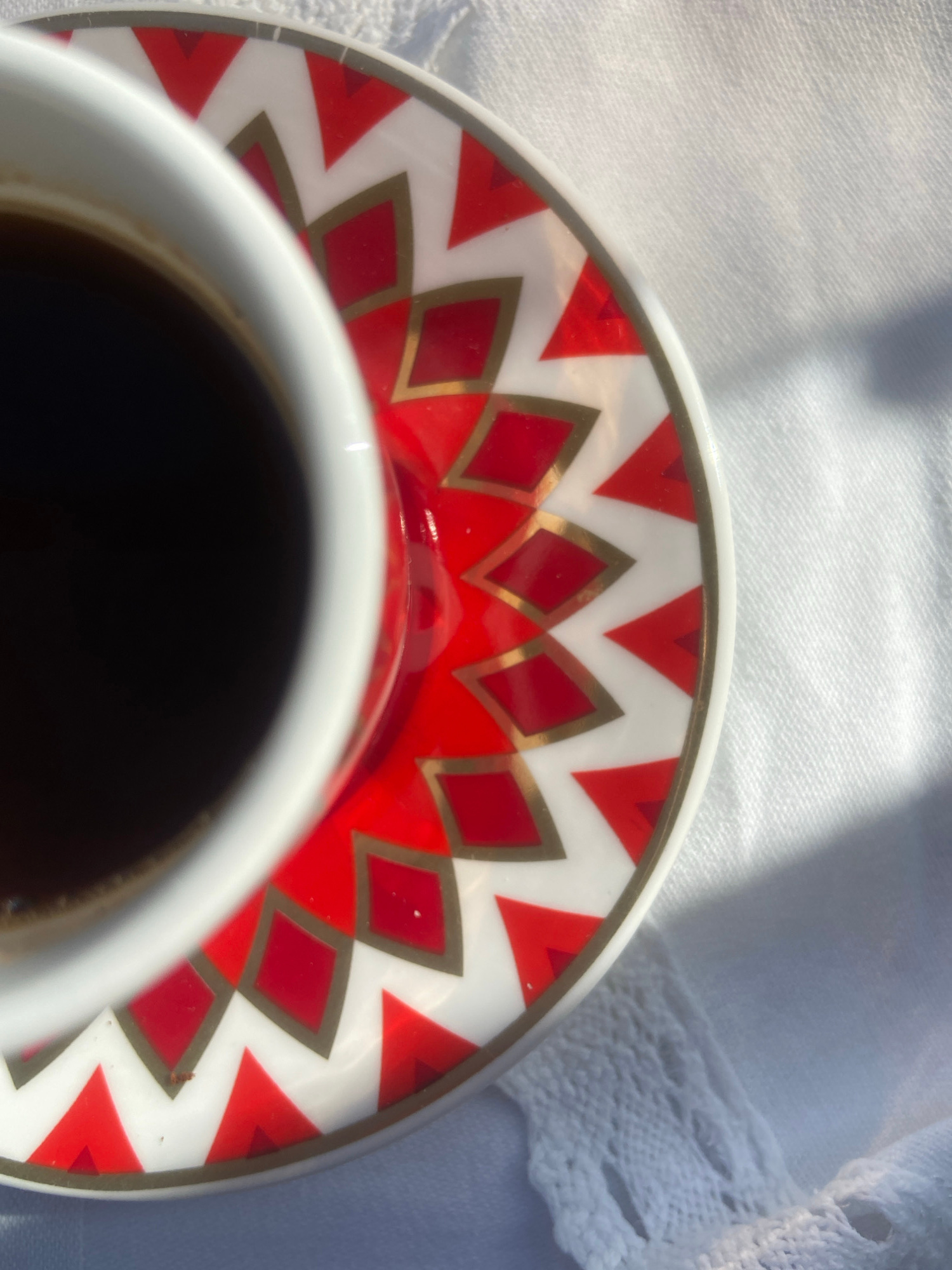 The image presents an intimate, top-down view of a white ceramic coffee cup and its matching saucer, resting on a white textured fabric. The cup, filled with a dark liquid (likely coffee), occupies th…read more