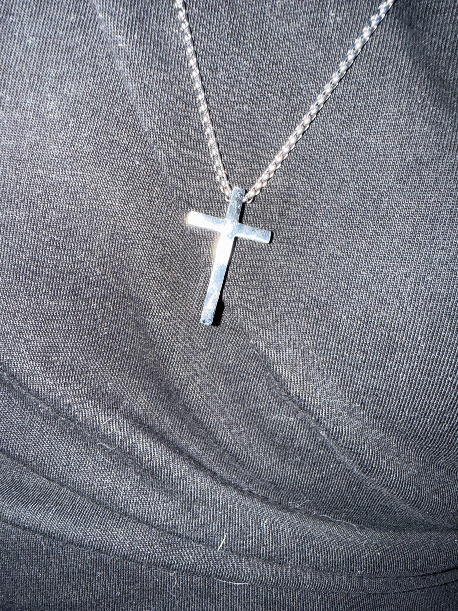 A silver cross pendant on a delicate silver chain rests on a dark, textured fabric, likely a piece of clothing. The cross is simple in design with clean lines. The fabric appears to be a fine-ribbed k…read more