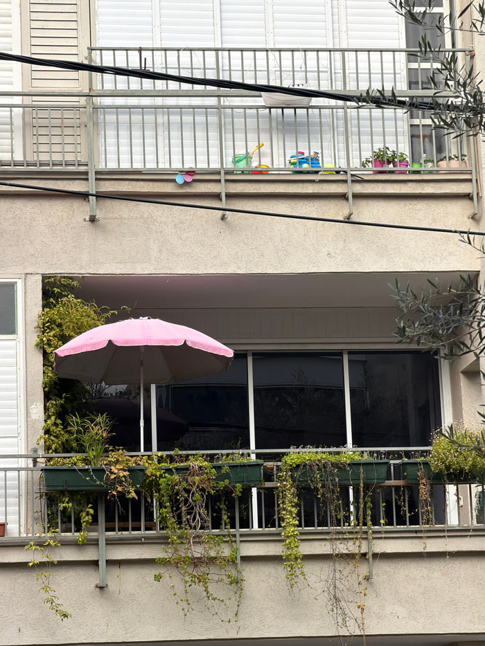 This image captures two balconies of a residential building, consistent with urban apartment architecture found in cities like Tel-Aviv, Israel. No specific landmarks are visible to pinpoint its exact…read more