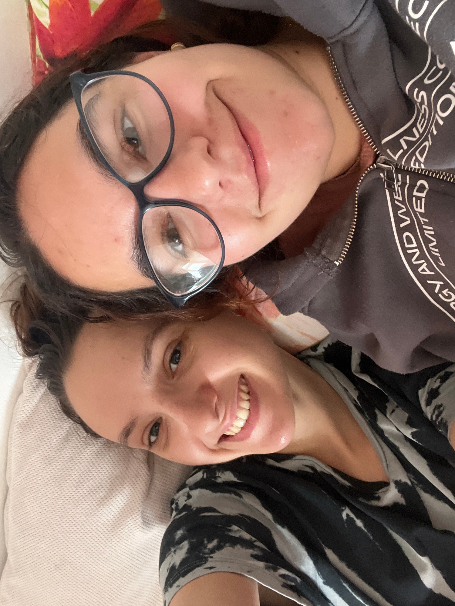 Two women are lying down next to each other, facing the camera. The woman on the left is wearing glasses and a dark hooded sweatshirt. The woman on the right is wearing a black and white patterned top…read more