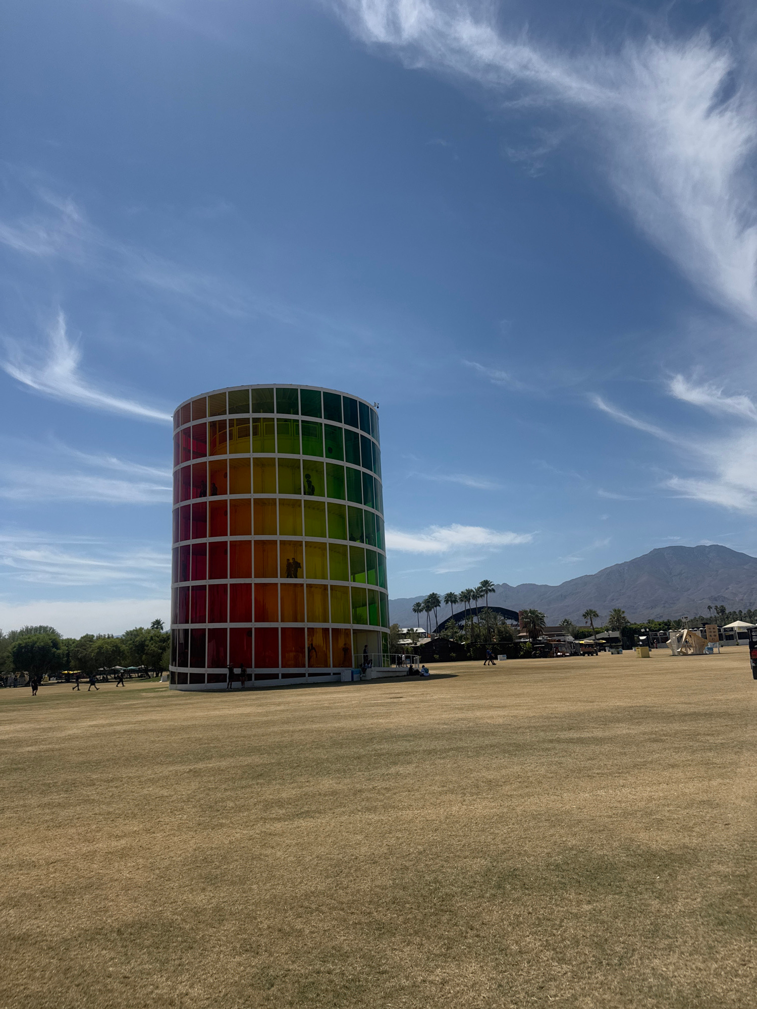 The image captures a cylindrical, multi-tiered, rainbow-colored structure in Indio, California, United States. The structure is constructed from a grid of rectangular panels with colors spanning fromβ¦read more