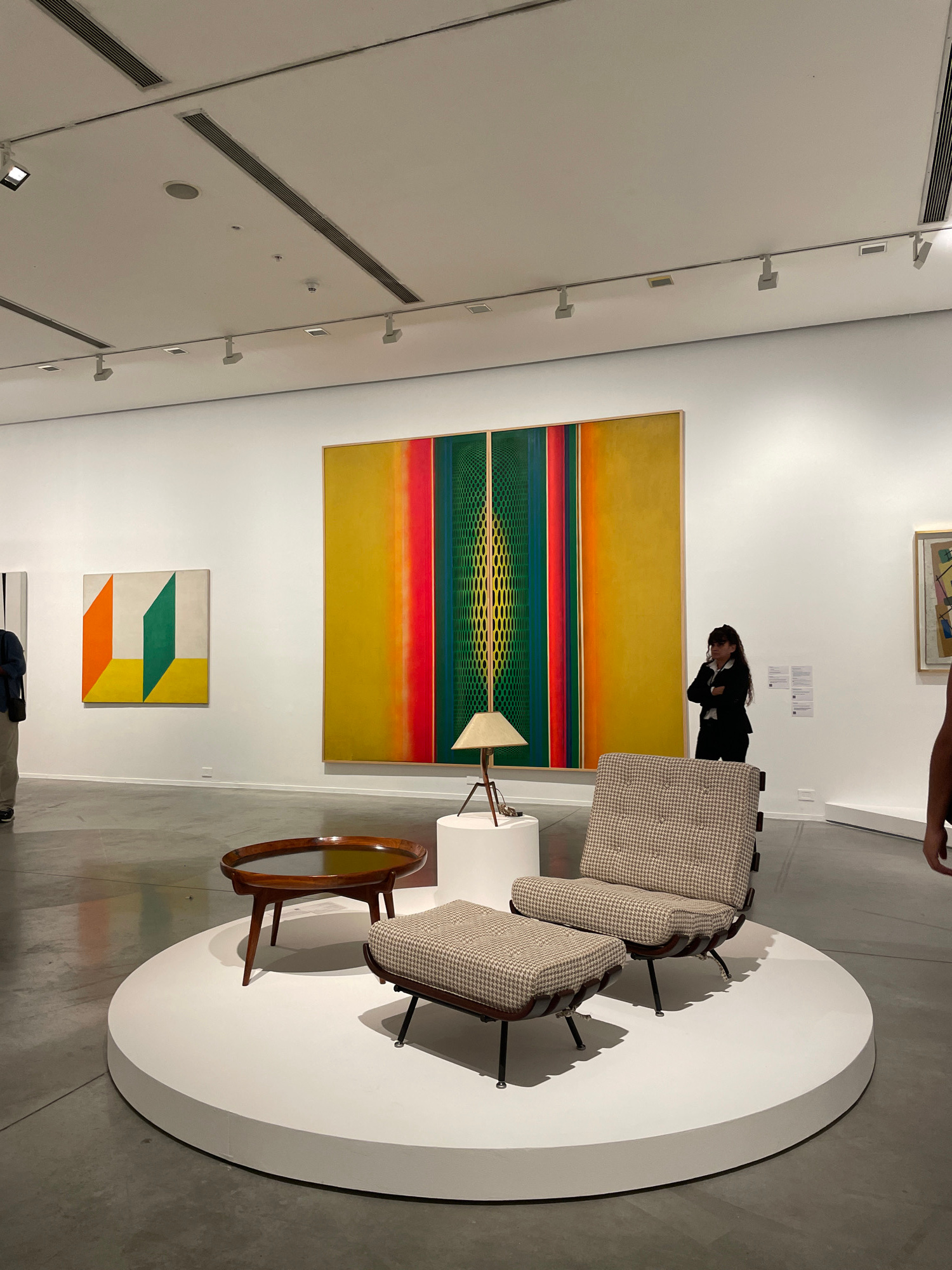 The image depicts an art gallery interior, likely in Buenos Aires, Argentina, though specific location cues are absent. The scene centers on two mid-century modern armchairs with patterned upholstery,…read more
