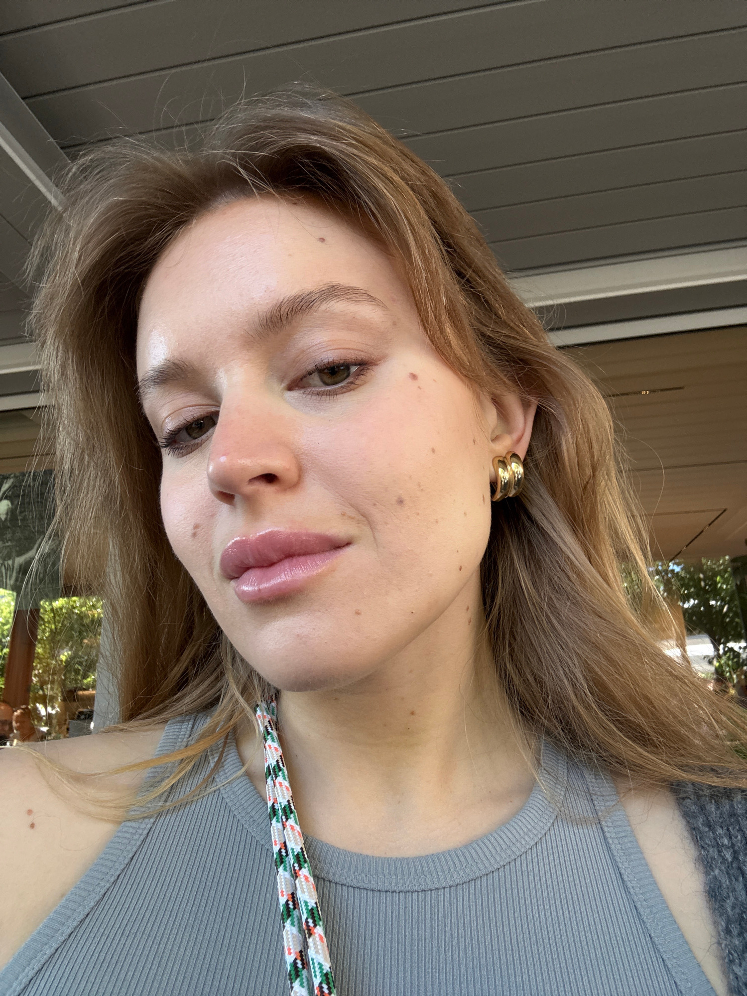 A young woman is pictured indoors. She has long, light brown hair and wears a gold hoop earring. She is facing the camera at an angle, wearing a gray ribbed tank top. A lanyard with white, green, red,…read more