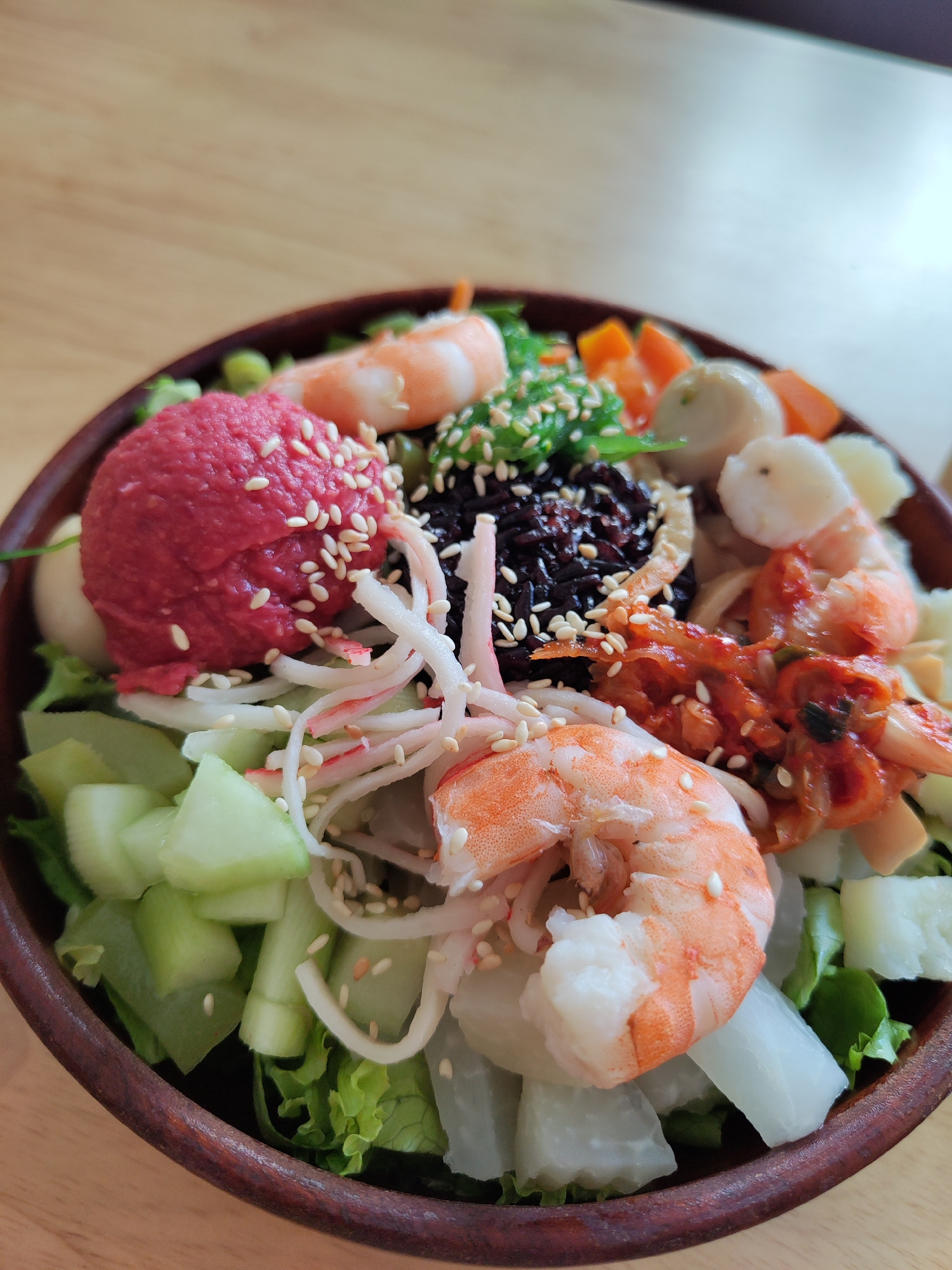 A close-up, high-angle shot depicts a bowl of poke-style food. The bowl appears to be made of dark wood. Ingredients include cooked shrimp, shredded imitation crab meat, diced cucumbers and white rad…read more