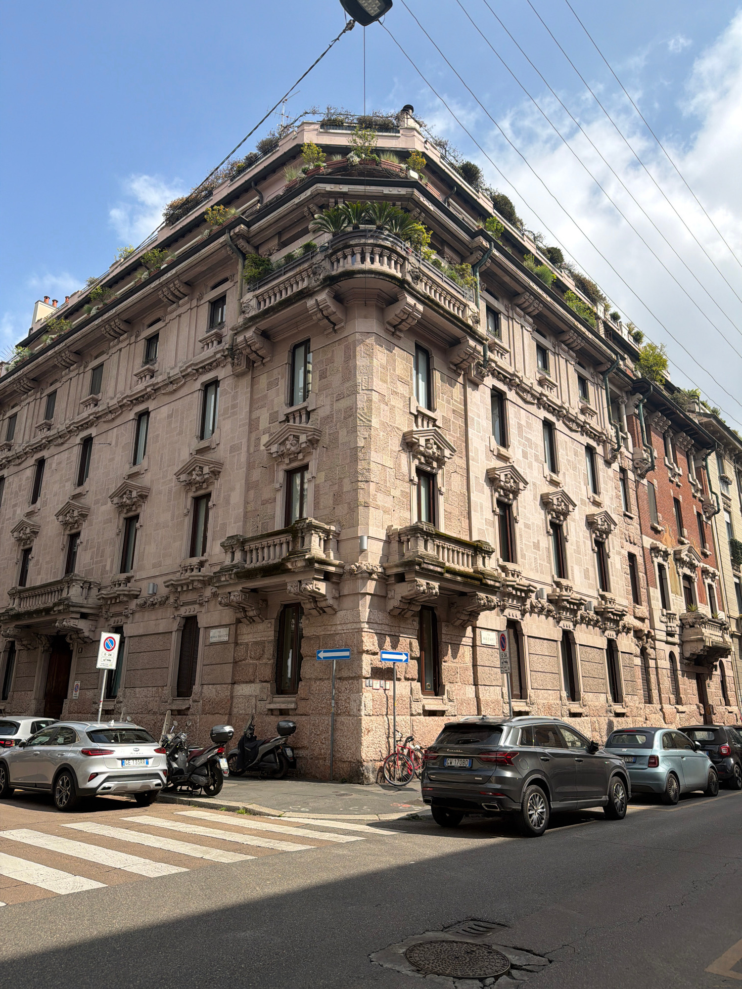 A low-angle, exterior shot depicts a building with ornate architectural details and greenery on its upper levels. The structure is predominantly light brown, with recurring geometric patterns around t…read more