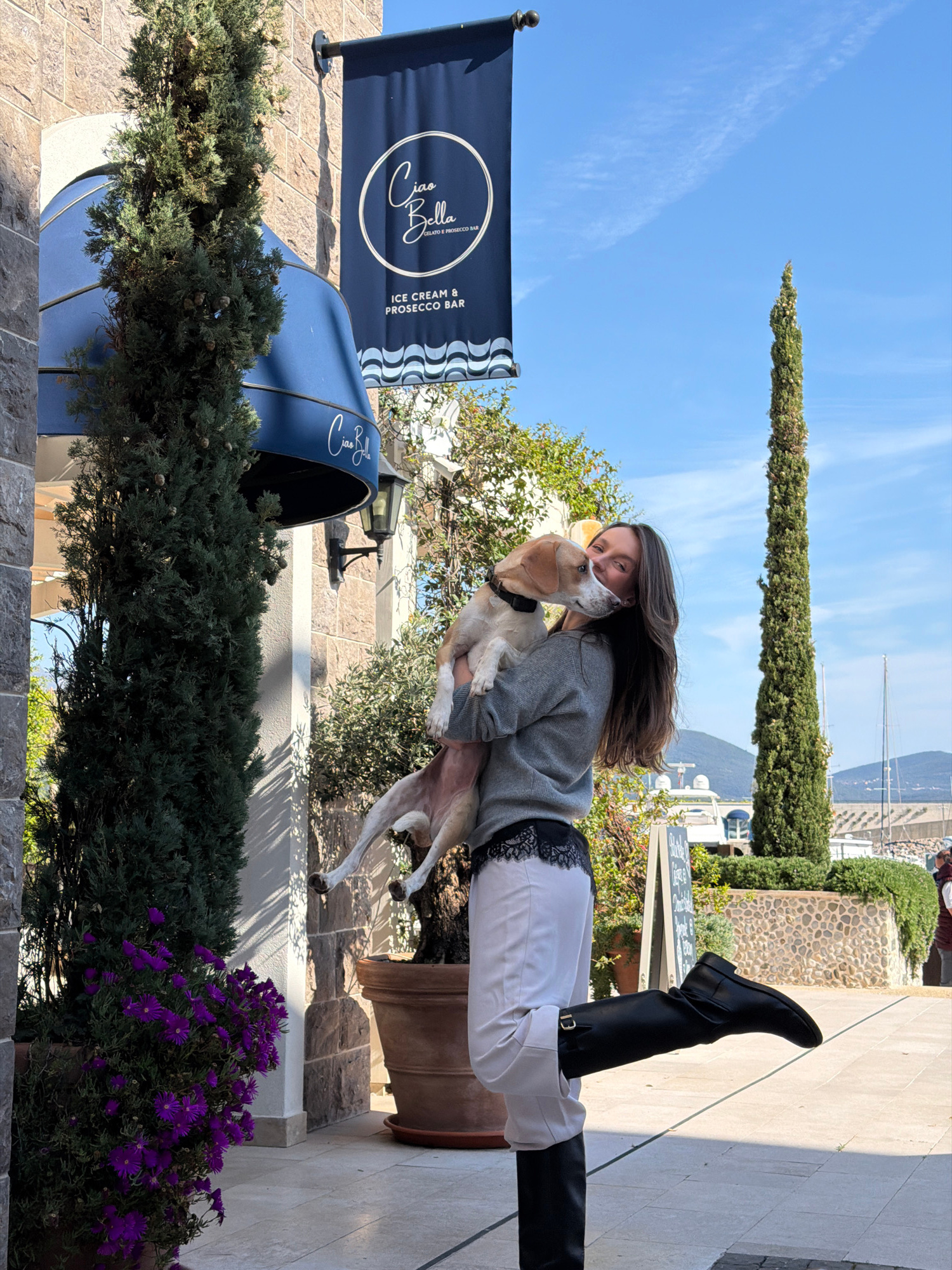 A woman wearing black riding boots, white pants, and a gray sweater stands outside the "Ciao Bella Ice Cream & Prosecco Bar" in Radovići, Montenegro. She is holding a white and tan dog, possibly a gre…read more