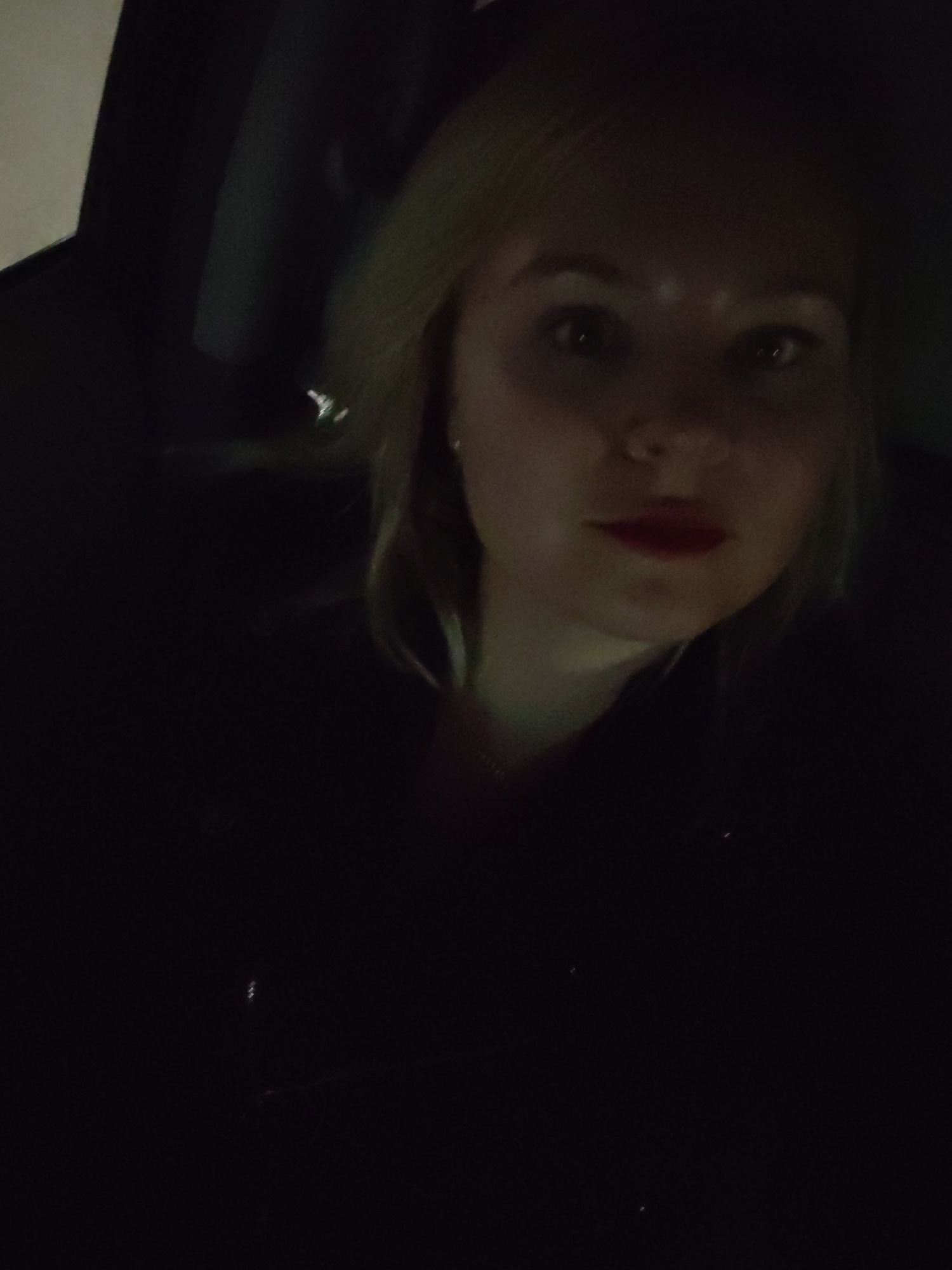 A dimly lit, close-up shot features a woman, possibly taking a selfie, inside what appears to be a car at night. The woman, with light blonde hair, is looking directly at the camera with wide, open ey…read more