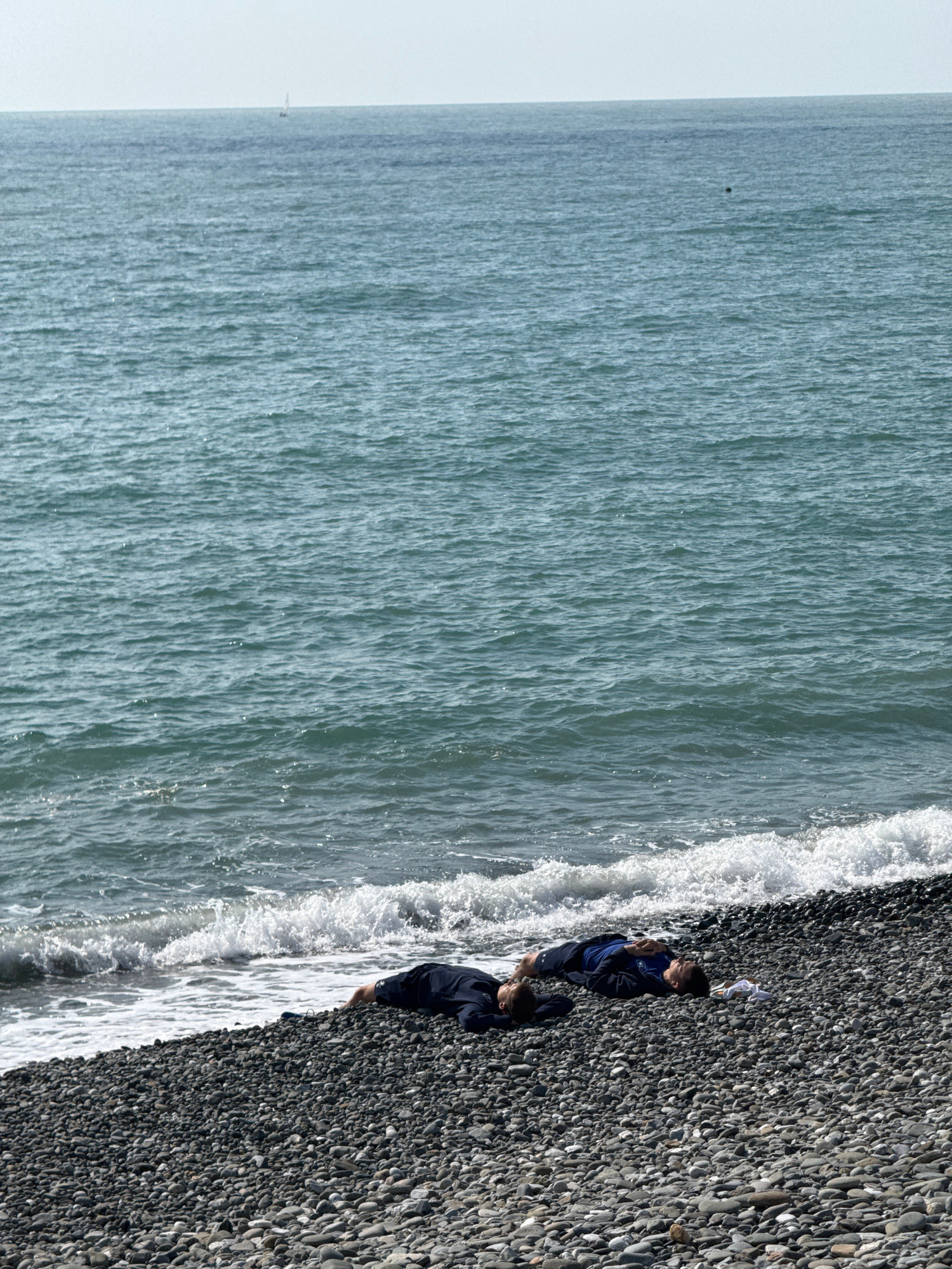 The image captures a serene coastal scene at a pebble beach in Sirius, Russia, under a bright, clear sky. The vast expanse of the sea stretches towards the horizon, meeting the sky in the distance. T…read more