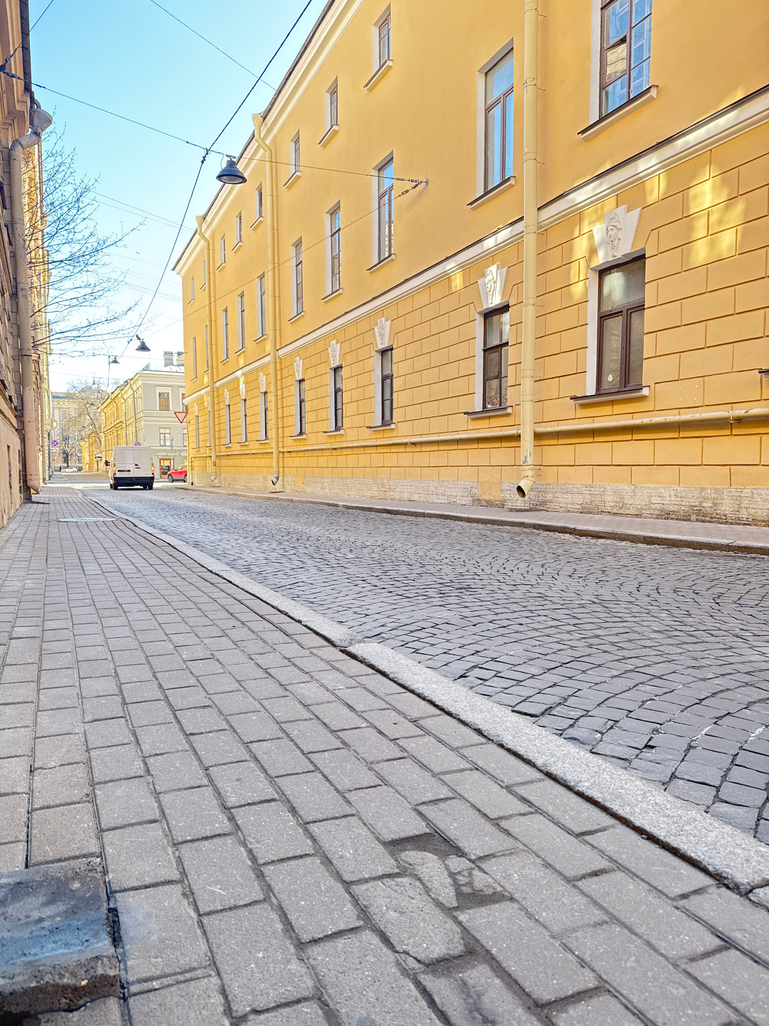 The image captures a sunny street scene in an urban environment, likely a narrow street or alleyway. The perspective is from ground level, looking down the street. To the left, a prominent multi-stor…read more